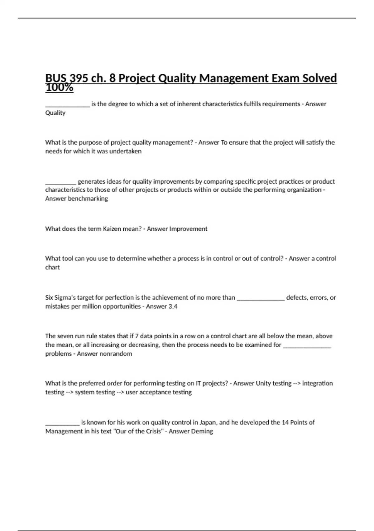 BUS 395 ch. 8: Project Quality Management Exam Solved 100%