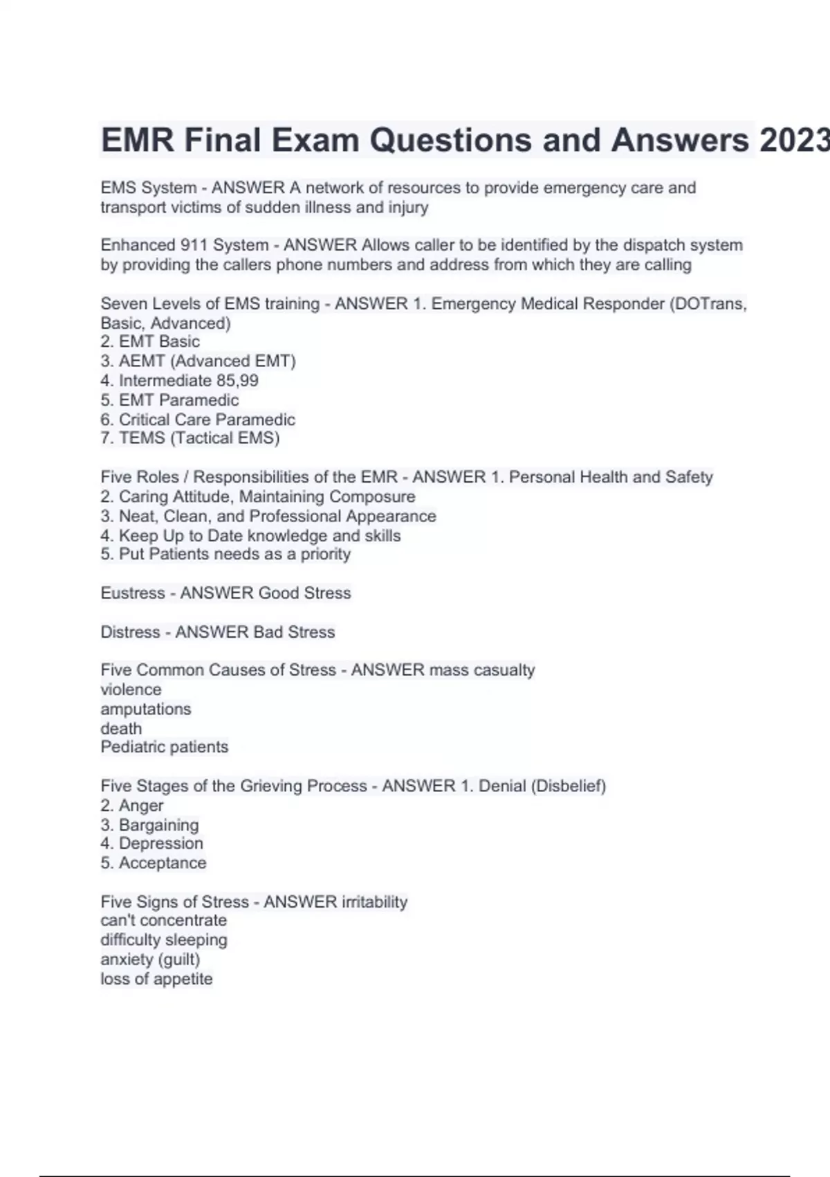 EMR Final Exam Questions and Answers 2023. EMS System - ANSWER A network of resources to provide emergency care and transport victims of sudden illness and injury Enhanced 911 System - ANSWER Allows caller to be identified by the dispatch system by providing the callers phone numbers and address from which they are calling Seven Levels of EMS training - ANSWER 1. Emergency Medical Responder (DOTrans, Basic, Advanced) 2. EMT Basic 3. AEMT (Advanced EMT) 4. Intermediate 85,99 5. EMT Paramedic 6. Critical Care Paramedic 7. TEMS (Tactical EMS) Five Roles / Responsibilities of the EMR - ANSWER 1. Personal Health and Safety 2. Caring Attitude, Maintaining Composure 3. Neat, Clean, and Professional Appearance 4. Keep Up to Date knowledge and skills 5. Put Patients needs as a priority Eustress - ANSWER Good Stress Distress - ANSWER Bad Stress Five Common Causes of Stress - ANSWER mass casualty violence amputations death Pediatric patients Five Stages of the Grieving Process - ANSWER 1. Denial (Disbelief) 2. Anger 3. Bargaining 4. Depression 5. Acceptance Five Signs of Stress - ANSWER irritability can't concentrate difficulty sleeping anxiety (guilt) loss of appetite Four Lifestyle Changes to Deal with Stress - ANSWER 1. Eat healthier 2. Exercise (Meditation) 3. Balance Work 4. Listening to Family and friends CISD - ANSWER Critical Incident Stress Debriefing Critical Incident Stress Debriefing: Purpose - ANSWER Deals with Traumatic Incidents, a debriefing is a confidential group meeting which encourages open discussion of the incident. The goal is to assist the EMS personal in dealing with the stress related to the incident Four Types of Body Substance Isolation - ANSWER Hand washing Proper disposal of medical equipment use of personal protective equipment Scene Safety (?) Scene Safety - ANSWER Assessment of scene (surroundings) that will provide information to the first responder and will help ensure their well-being Scope of Practice - ANSWER The legal duties to the patient, medical director, and public Standard of Care - ANSWER care expected based on training and experience taking into account the conditions under which the care is rendered Competence - ANSWER The ability to understand questions and to the implication of decisions made ( do you know who / where / what you are? ) Expressed Consent - ANSWER The patient must be told in an easy to understand nature and the extent of the procedure to be preformed as well as the possible risks involved Implied Consent - ANSWER Consent based on the assumption that the unresponsive patient would consent to life saving interventions Advanced Directives - ANSWER Written documentation that specifies what medical treatment a patient wishes to have and what to withhold should the patient become unable to make a decision Assault and Battery - ANSWER Unlawfully touching a patient without consent providing emergency medical care when a competent patient does not consent to the emergency medical care .