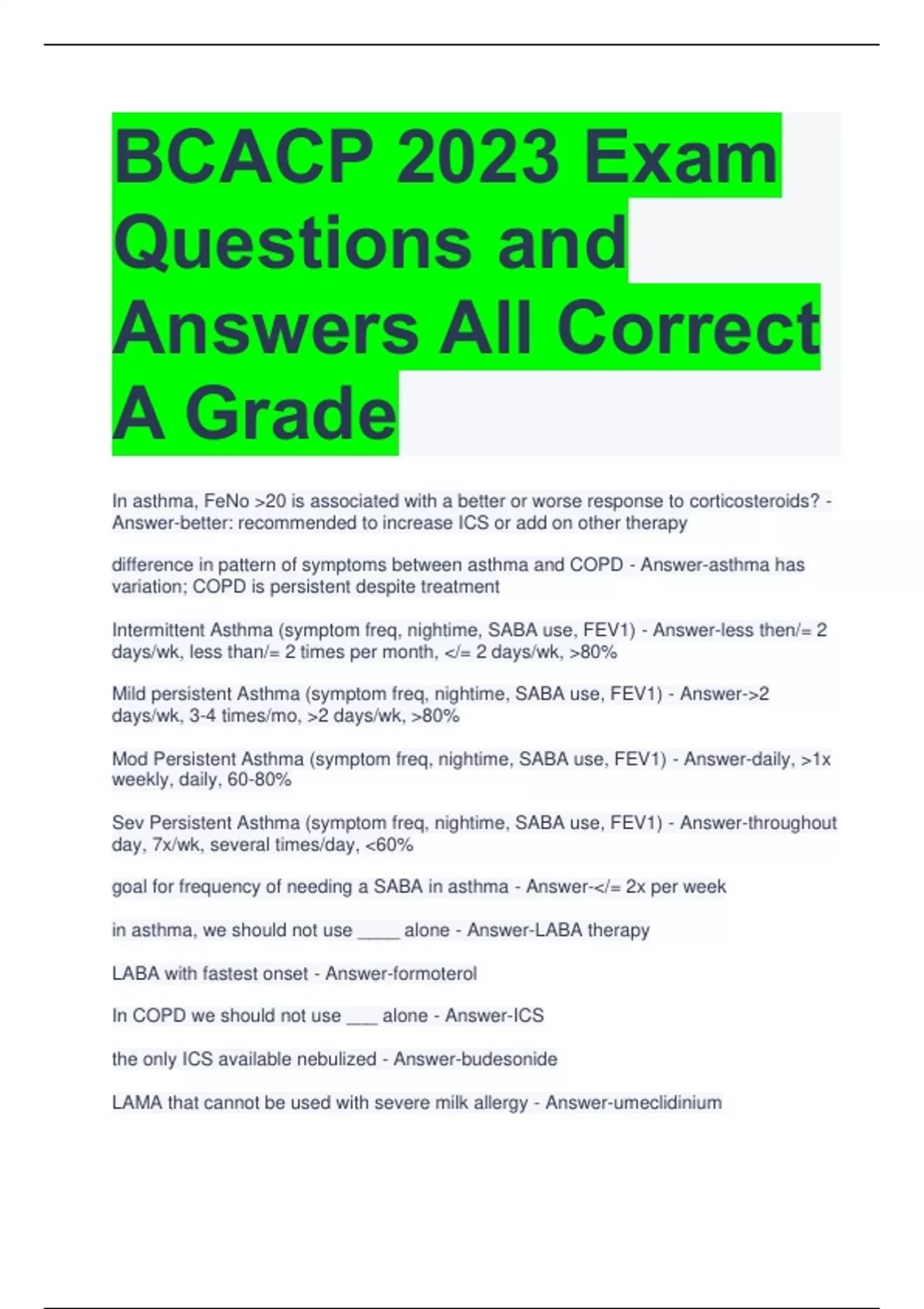 BCACP 2023 Exam Questions and Answers All Correct A Grade In asthma, FeNo 20 is associated with a better or worse response to corticosteroids? - Answer-better: recommended to increase ICS or add on other therapy difference in pattern of symptoms between asthma and COPD - Answer-asthma has variation; COPD is persistent despite treatment Intermittent Asthma (symptom freq, nightime, SABA use, FEV1) - Answer-less then/= 2 days/wk, less than/= 2 times per month, /= 2 days/wk, 80% Mild persistent Asthma (symptom freq, nightime, SABA use, FEV1) - Answer-2 days/wk, 3-4 times/mo, 2 days/wk, 80% Mod Persistent Asthma (symptom freq, nightime, SABA use, FEV1) - Answer-daily, 1x weekly, daily, 60-80% Sev Persistent Asthma (symptom freq, nightime, SABA use, FEV1) - Answer-throughout day, 7x/wk, several times/day, 60% goal for frequency of needing a SABA in asthma - Answer-/= 2x per week in asthma, we should not use ____ alone - Answer-LABA therapy LABA with fastest onset - Answer-formoterol In COPD we should not use ___ alone - Answer-ICS the only ICS available nebulized - Answer-budesonide LAMA that cannot be used with severe milk allergy - Answer-umeclidinium theophylline goal trough - Answer-5-15; clearance decreases with age when do we consider stepping down asthma treatment? - Answer-well controlled for 3 months What MDI inhalers do not need to be shaken? - Answer-alvesvo, QVAR, atrovent respimat education: when to prime - Answer-spray 1 puff if not used in 3 days; spray 3x if not used for 21 days GOLD grades 1-4 according to FEV1 - Answer-1: /= 80% 2: 50-79% 3: 30-49% 4: 30% COPD treatment according to pt groups A-D - Answer-A: SAMA/SABA/LAMA/LABA B: LABA or LAMA C: LAMA D: LAMA or LABA+LAMA or ICS+LABA