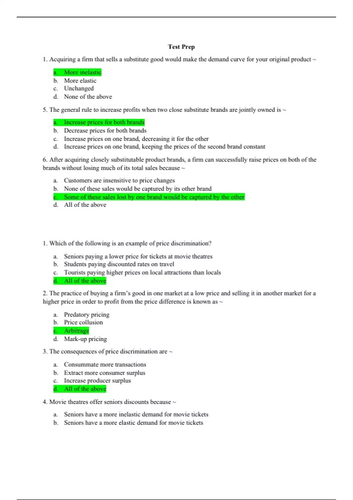 1. Acquiring a firm that sells a substitute good would make the demand curve for your original product ~ 2. The general rule to increase profits when two close substitute brands are jointly owned is ~ 3. After acquiring closely substitutable product brands, a firm can successfully raise prices on both of the brands without losing much of its total sales because ~ 4. Which of the following is an example of price discrimination? 5. The practice of buying a firm’s good in one market at a low price and selling it in another market for a higher price in order to profit from the price difference is known as ~ 6. The consequences of price discrimination are ~ 7. Movie theatres offer seniors discounts because ~ 8. When a firm practices perfect price discrimination, 9. Public transit offers discounted monthly passes to students, which can only be bought and used with valid student IDs. The transit system is using ~ 10. In which of the following cases does the Robinson-Patman act not apply? 11. The “damaged goods” strategy refers to 12. When the market is in equilibrium, 13. When difference between the minimum price the producer is willing to accept and the price the producer actually receives for a product is referred to as: 14. If you are are willing to sell your lawn mower business for $355,000 and someone offers you $420,000 for it,this transaction will generate: 15. Taxes cause: 16. A price ceiling is binding when. 17. Economic reasoning is based on the premise that: 18. Social forces: 19. One lesson of business: 20. The difference between the maximum price the consumer is willing to pay and the price the consumer actually pays for a product is referred to as: 21. If you are willing to sell your car business for $500,000 and someone offers you $420,000 for it, this transaction will generate: 22. If you are willing to purchase a house for $500,000 and you purchase the house for $500,000, this transaction will generate: