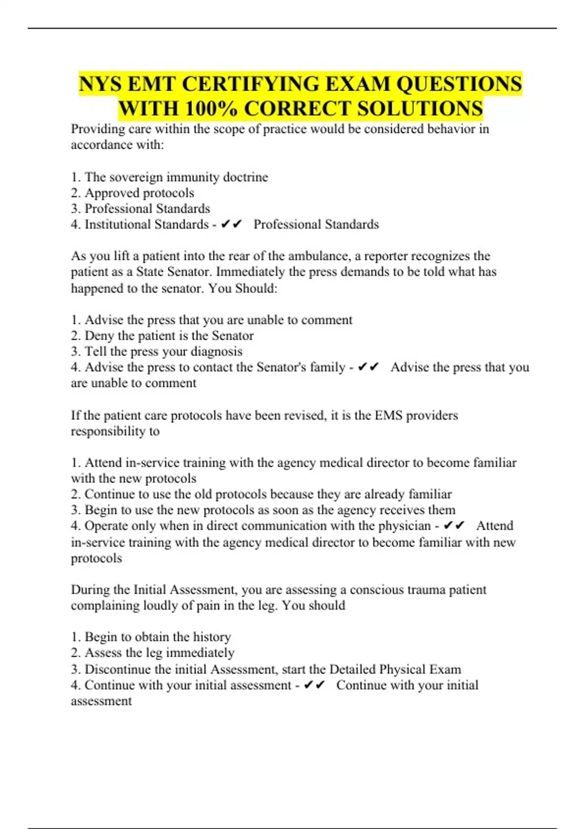 NYS EMT CERTIFYING EXAM QUESTIONS WITH 100% CORRECT SOLUTIONS