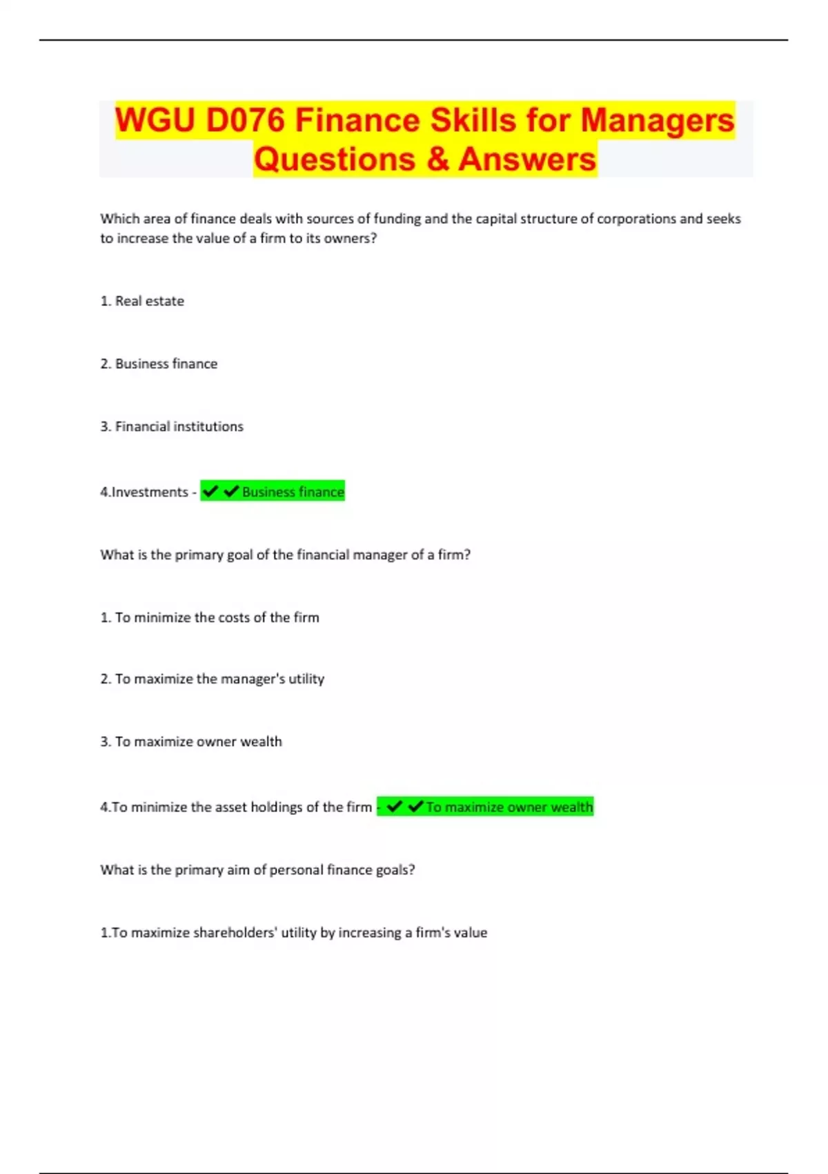 WGU D076 Finance Skills for Managers Questions & Answers | Latest 2023/24 | Updated & Verified | Guaranteed Success | 40 Pages