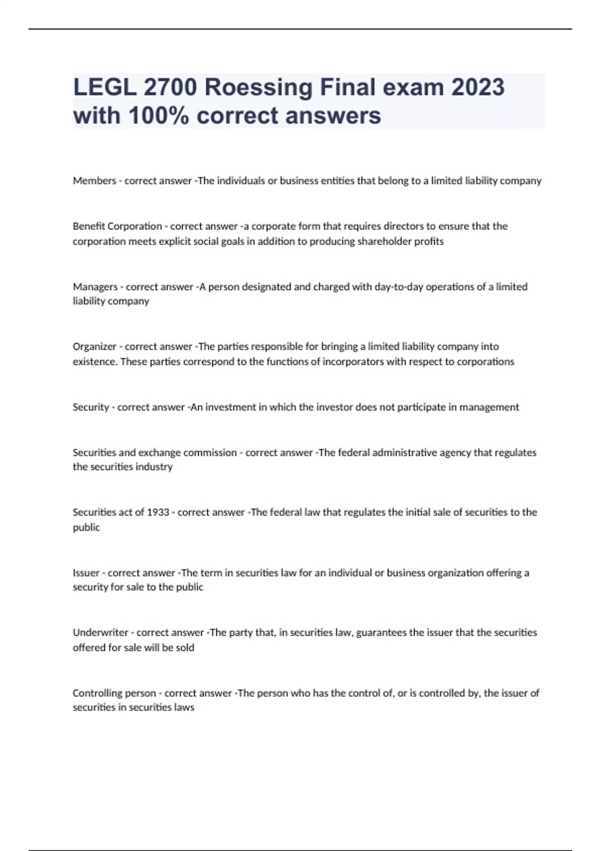 Members - correct answer -The individuals or business entities that belong to a limited liability company Benefit Corporation - correct answer -a corporate form that requires directors to ensure that the corporation meets explicit social goals in addition to producing shareholder profits Managers - correct answer -A person designated and charged with day-to-day operations of a limited liability company Organizer - correct answer -The parties responsible for bringing a limited liability company into existence. These parties correspond to the functions of incorporators with respect to corporations Security - correct answer -An investment in which the investor does not participate in management Securities and exchange commission - correct answer -The federal administrative agency that regulates the securities industry Securities act of 1933 - correct answer -The federal law that regulates the initial sale of securities to the public Issuer - correct answer -The term in securities law for an individual or business organization offering a security for sale to the public Underwriter - correct answer -The party that, in securities law, guarantees the issuer that the securities offered for sale will be sold Controlling person - correct answer -The person who has the control of, or is controlled by, the issuer of securities in securities laws Seller - correct answer -In commercial law, a person who sells of contracts to sell goods Closely held - correct answer -An organization that is owned by only a few people Publicly held - correct answer -A business organization that has hundreds, if not thousands, of owners who can exchange their ownership interests on public exchanges Dissolution - correct answer -The cancellation of an agreement, thereby rescinding its binding force. Sole proprietorship - correct answer -The simplest form of business organization, created and controlled by one owner