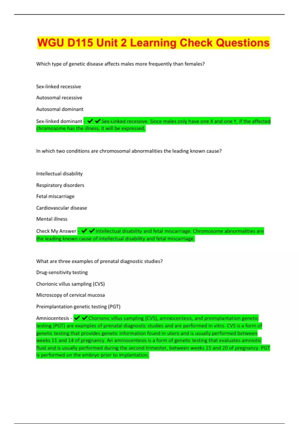 Which type of genetic disease affects males more frequently than females? Sex-linked recessive Autosomal recessive Autosomal dominant Sex-linked dominant - Sex-Linked recessive. Since males only have one X and one Y, if the affected chromosome has the illness, it will be expressed. In which two conditions are chromosomal abnormalities the leading known cause? Intellectual disability Respiratory disorders Fetal miscarriage Cardiovascular disease Mental illness Check My Answer - Intellectual disability and fetal miscarriage. Chromosome abnormalities are the leading known cause of intellectual disability and fetal miscarriage. What are three examples of prenatal diagnostic studies? Drug-sensitivity testing Chorionic villus sampling (CVS) Microscopy of cervical mucosa Preimplantation genetic testing (PGT) Amniocentesis -