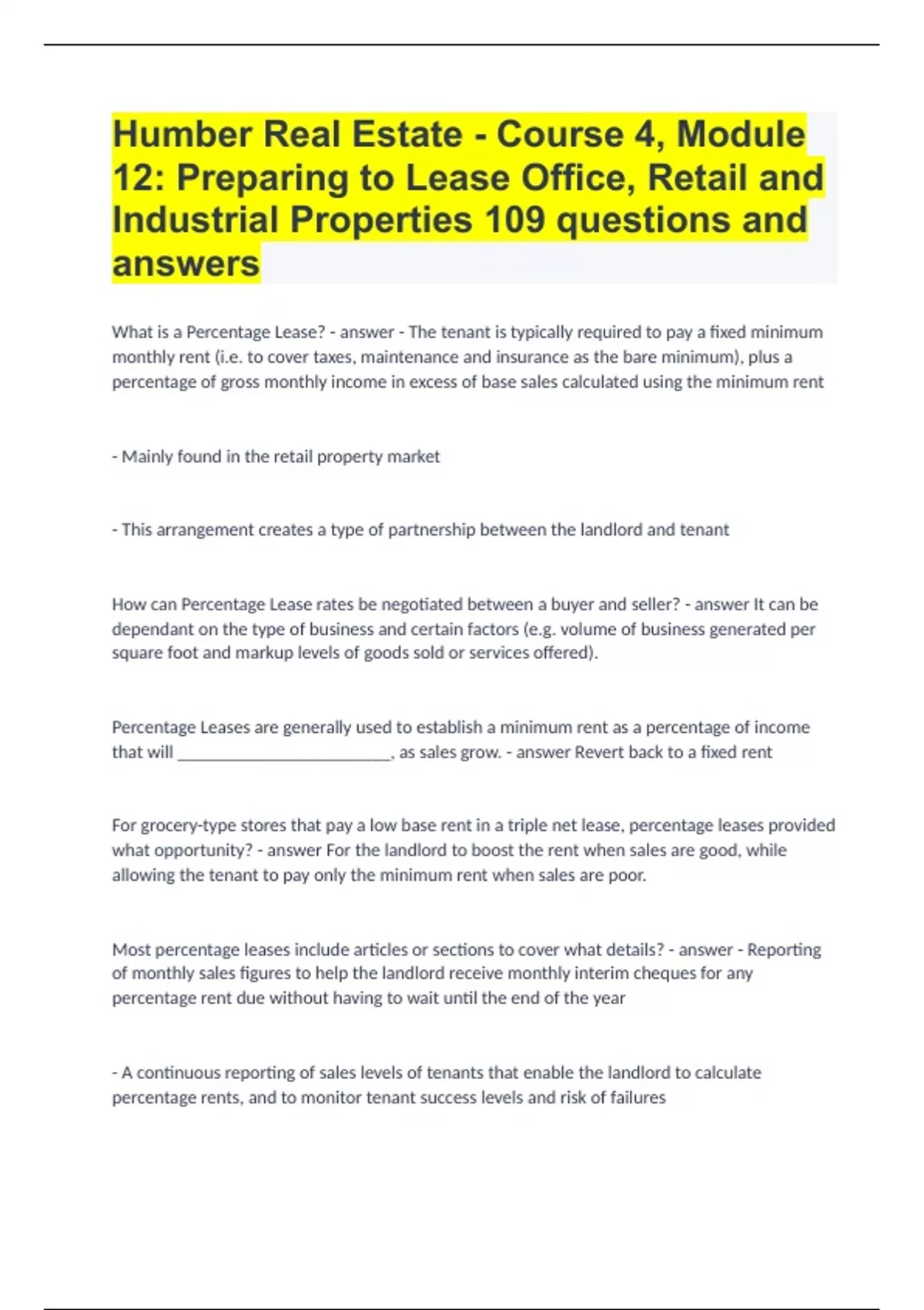 Humber Real Estate - Course 4, Module 12: Preparing to Lease Office, Retail and Industrial Properties|109 questions and answers