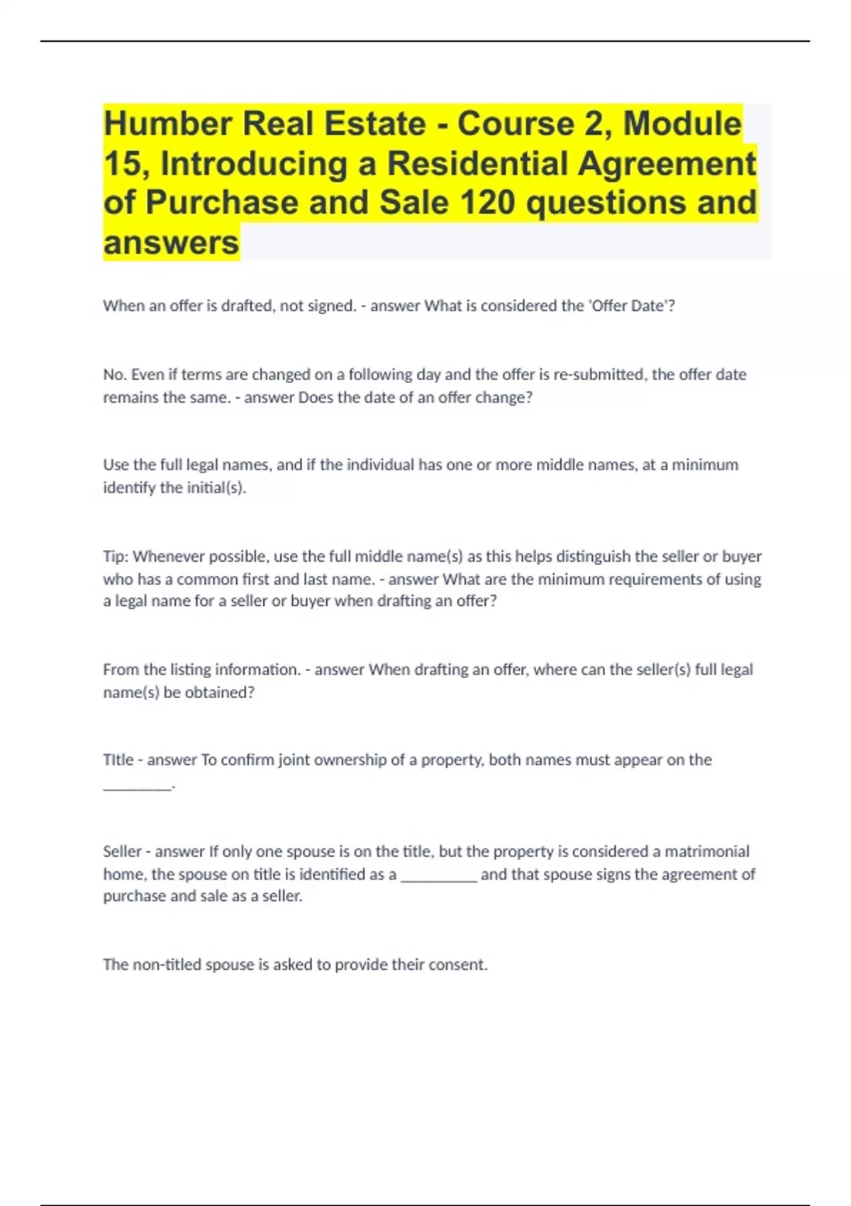 Humber Real Estate - Course 2, Module 15, Introducing a Residential Agreement of Purchase and Sale |120 questions and answers