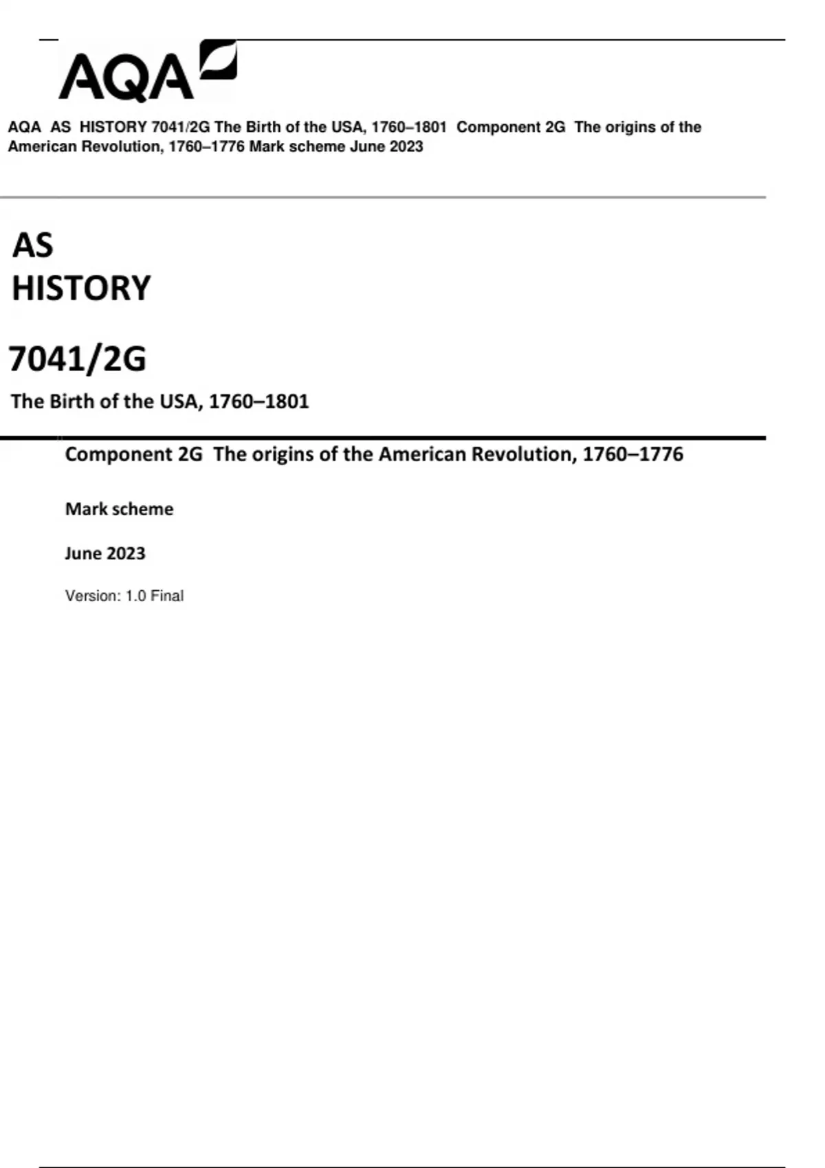 AQA AS HISTORY 7041/2G The Birth of the USA, 1760–1801 Component 2G The origins of the American Revolution, 1760–1776 Mark scheme June 2023