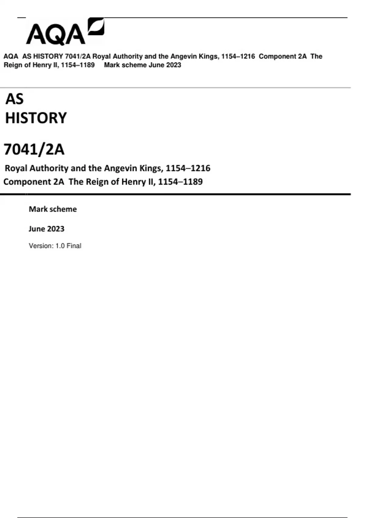 AQA AS HISTORY 7041/2A Royal Authority and the Angevin Kings, 1154–1216 Component 2A The Reign of Henry II, 1154–1189 Mark scheme June 2023
