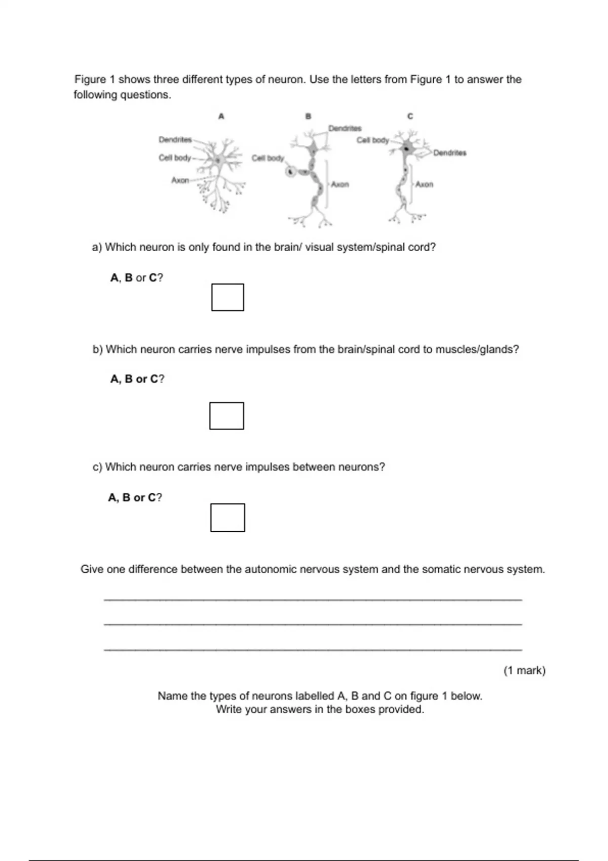 Name the types of neurons labelled A, B and C on figure 1 below.