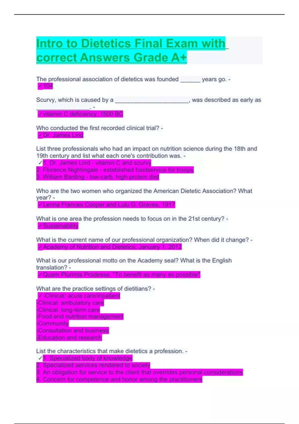 Intro to Dietetics Final Exam with correct Answers Grade A+.
