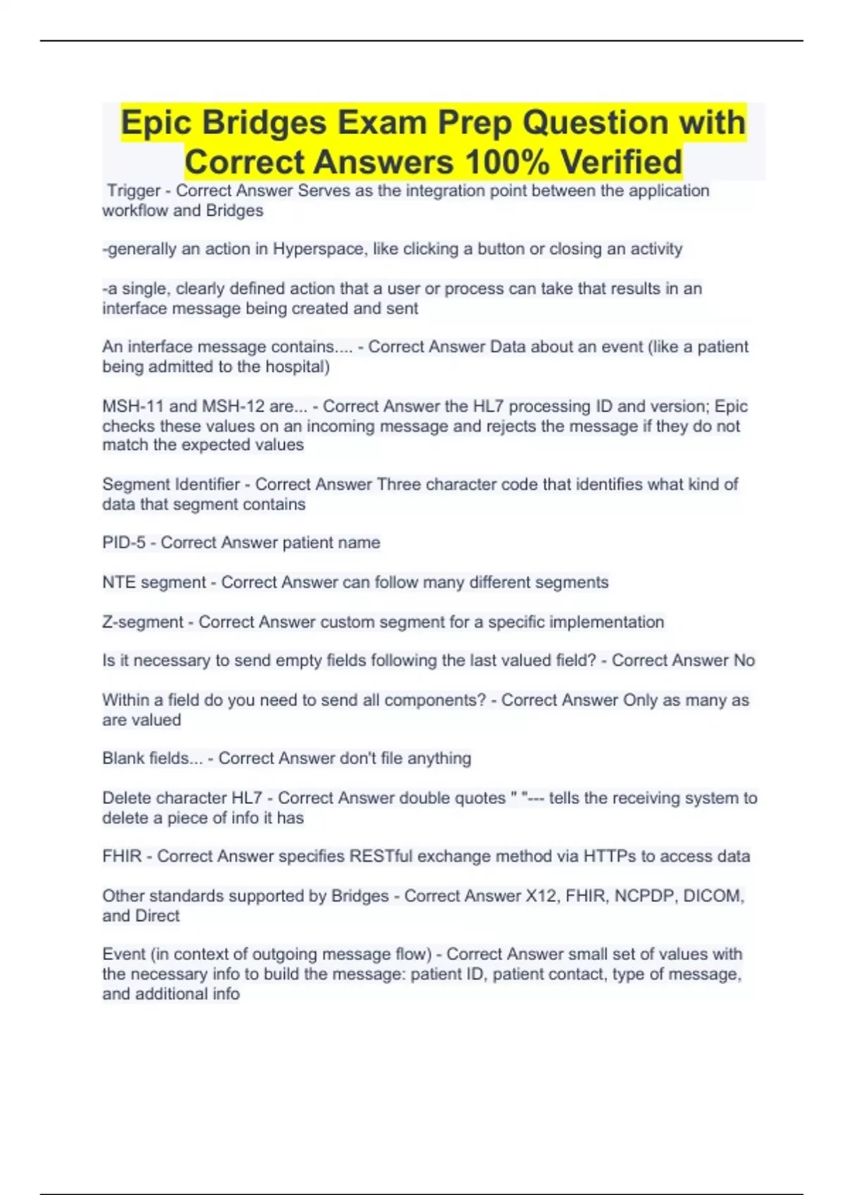 Trigger - Correct Answer Serves as the integration point between the application workflow and Bridges -generally an action in Hyperspace, like clicking a button or closing an activity -a single, clearly defined action that a user or process can take that results in an interface message being created and sent An interface message contains.... - Correct Answer Data about an event (like a patient being admitted to the hospital) MSH-11 and MSH-12 are... - Correct Answer the HL7 processing ID and version; Epic checks these values on an incoming message and rejects the message if they do not match the expected values Segment Identifier - Correct Answer Three character code that identifies what kind of data that segment contains PID-5 - Correct Answer patient name NTE segment - Correct Answer can follow many different segments Z-segment - Correct Answer custom segment for a specific implementation Is it necessary to send empty fields following the last valued field? - Correct Answer No Within a field do you need to send all components? - Correct Answer Only as many as are valued Blank fields... - Correct Answer don't file anything Delete character HL7 - Correct Answer double quotes " "--- tells the receiving system to delete a piece of info it has FHIR - Correct Answer specifies RESTful exchange method via HTTPs to access data Other standards supported by Bridges - Correct Answer X12, FHIR, NCPDP, DICOM, and Direct Event (in context of outgoing message flow) - Correct Answer small set of values with the necessary info to build the message: patient ID, patient contact, type of message, and additional info