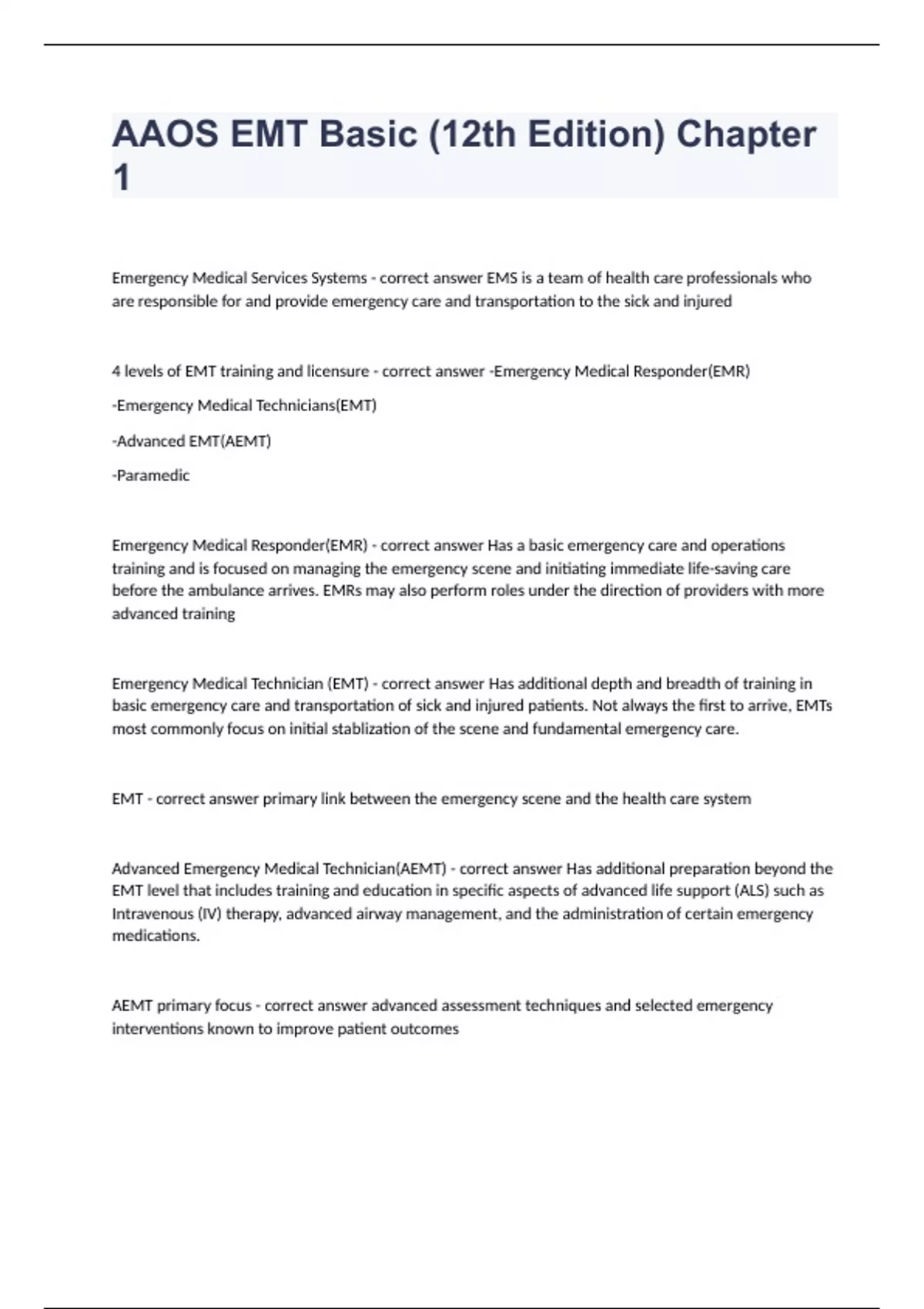 AAOS EMT Basic (12th Edition) Chapter 1Emergency Medical Services Systems - correct answer EMS is a team of health care professionals who are responsible for and provide emergency care and transportation to the sick and injured 4 levels of EMT training and licensure - correct answer -Emergency Medical Responder(EMR) -Emergency Medical Technicians(EMT) -Advanced EMT(AEMT) -Paramedic Emergency Medical Responder(EMR) - correct answer Has a basic emergency care and operations training and is focused on managing the emergency scene and initiating immediate life-saving care before the ambulance arrives. EMRs may also perform roles under the direction of providers with more advanced training Emergency Medical Technician (EMT) - correct answer Has additional depth and breadth of training in basic emergency care and transportation of sick and injured patients. Not always the first to arrive, EMTs most commonly focus on initial stablization of the scene and fundamental emergency care. EMT - correct answer primary link between the emergency scene and the health care system Advanced Emergency Medical Technician(AEMT) - correct answer Has additional preparation beyond the EMT level that includes training and education in specific aspects of advanced life support (ALS) such as Intravenous (IV) therapy, advanced airway management, and the administration of certain emergency medications. AEMT primary focus - correct answer advanced assessment techniques and selected emergency interventions known to improve patient outcomes