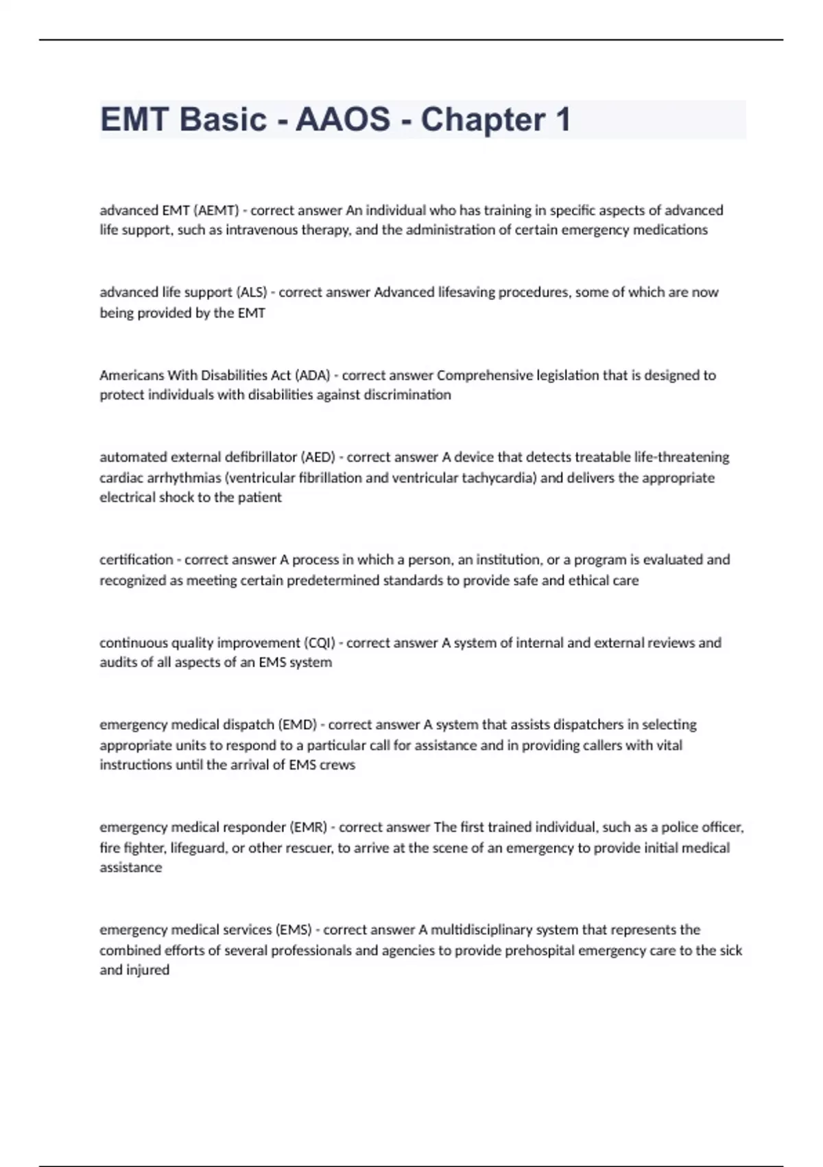 EMT Basic - AAOS - Chapter 1advanced EMT (AEMT) - correct answer An individual who has training in specific aspects of advanced life support, such as intravenous therapy, and the administration of certain emergency medications advanced life support (ALS) - correct answer Advanced lifesaving procedures, some of which are now being provided by the EMT Americans With Disabilities Act (ADA) - correct answer Comprehensive legislation that is designed to protect individuals with disabilities against discrimination automated external defibrillator (AED) - correct answer A device that detects treatable life-threatening cardiac arrhythmias (ventricular fibrillation and ventricular tachycardia) and delivers the appropriate electrical shock to the patient certification - correct answer A process in which a person, an institution, or a program is evaluated and recognized as meeting certain predetermined standards to provide safe and ethical care continuous quality improvement (CQI) - correct answer A system of internal and external reviews and audits of all aspects of an EMS system emergency medical dispatch (EMD) - correct answer A system that assists dispatchers in selecting appropriate units to respond to a particular call for assistance and in providing callers with vital instructions until the arrival of EMS crews emergency medical responder (EMR) - correct answer The first trained individual, such as a police officer, fire fighter, lifeguard, or other rescuer, to arrive at the scene of an emergency to provide initial medical assistance emergency medical services (EMS) - correct answer A multidisciplinary system that represents the combined efforts of several professionals and agencies to provide prehospital emergency care to the sick and injured