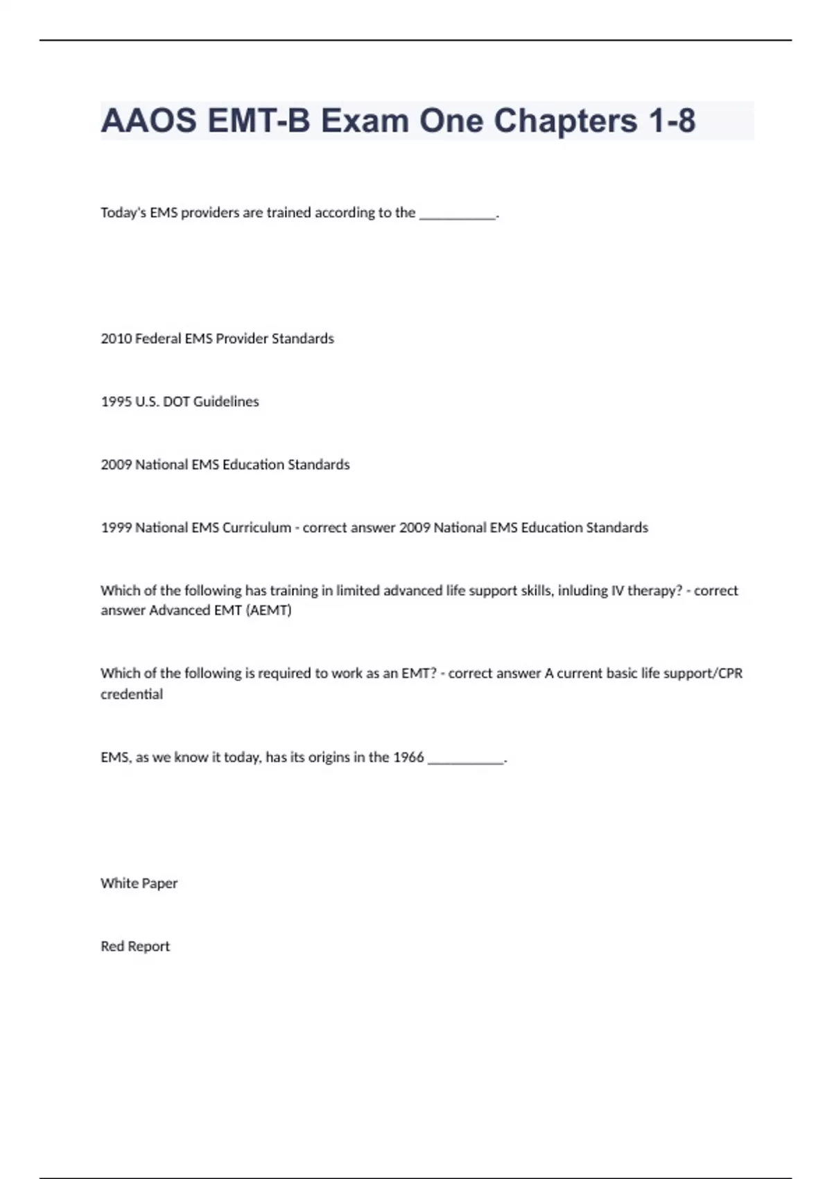 AAOS EMT-B Exam One Chapters 1-8Today's EMS providers are trained according to the __________. 2010 Federal EMS Provider Standards 1995 U.S. DOT Guidelines 2009 National EMS Education Standards 1999 National EMS Curriculum - correct answer 2009 National EMS Education Standards Which of the following has training in limited advanced life support skills, inluding IV therapy? - correct answer Advanced EMT (AEMT) Which of the following is required to work as an EMT? - correct answer A current basic life support/CPR credential EMS, as we know it today, has its origins in the 1966 __________. White Paper Red Report EMS Chronicles Prehospital Roundtable - correct answer White Paper One of the most important recent advances in prehospital care is the - correct answer AED Which of the following is a nationally recognized component of an EMS system? - correct answer Public education Which of the following is an advantage of enhanced 9-1-1 systems over regular 9-1-1 systems? - correct answer Potential use of GPS technology Who is ultimately responsible for ensuring quality control for all EMTs as an EMS agency? - correct answer The medical director A proactive approach to public health focuses on - correct answer prevention of injury and illness By definition, pandemic illnesses have - correct answer spread throughout the world Doing what is best for the patient is known as - correct answer Patient advocacy Empathy requires the EMT to - correct answer Consider the needs of others Dressing and acting appropriately while on duty are examples of - correct answer Professional attributes Roles and responsibilities of the EMT include - correct answer Providing on-scene leadership EMRs such as fire fighters, law enforcement officers, and park rangers, are an integral part of the EMS system because: - correct answer They often arrive at the scene before the ambulance and EMTs