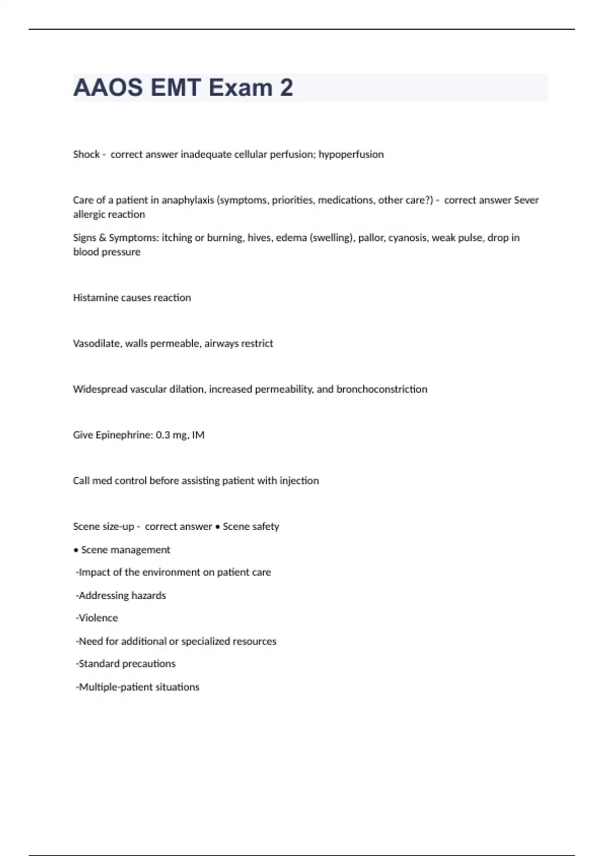 AAOS EMT Exam 2Shock - correct answer inadequate cellular perfusion; hypoperfusion Care of a patient in anaphylaxis (symptoms, priorities, medications, other care?) - correct answer Sever allergic reaction Signs & Symptoms: itching or burning, hives, edema (swelling), pallor, cyanosis, weak pulse, drop in blood pressure Histamine causes reaction Vasodilate, walls permeable, airways restrict Widespread vascular dilation, increased permeability, and bronchoconstriction Give Epinephrine: 0.3 mg, IM Call med control before assisting patient with injection Scene size-up - correct answer • Scene safety • Scene management -Impact of the environment on patient care -Addressing hazards -Violence -Need for additional or specialized resources -Standard precautions -Multiple-patient situations