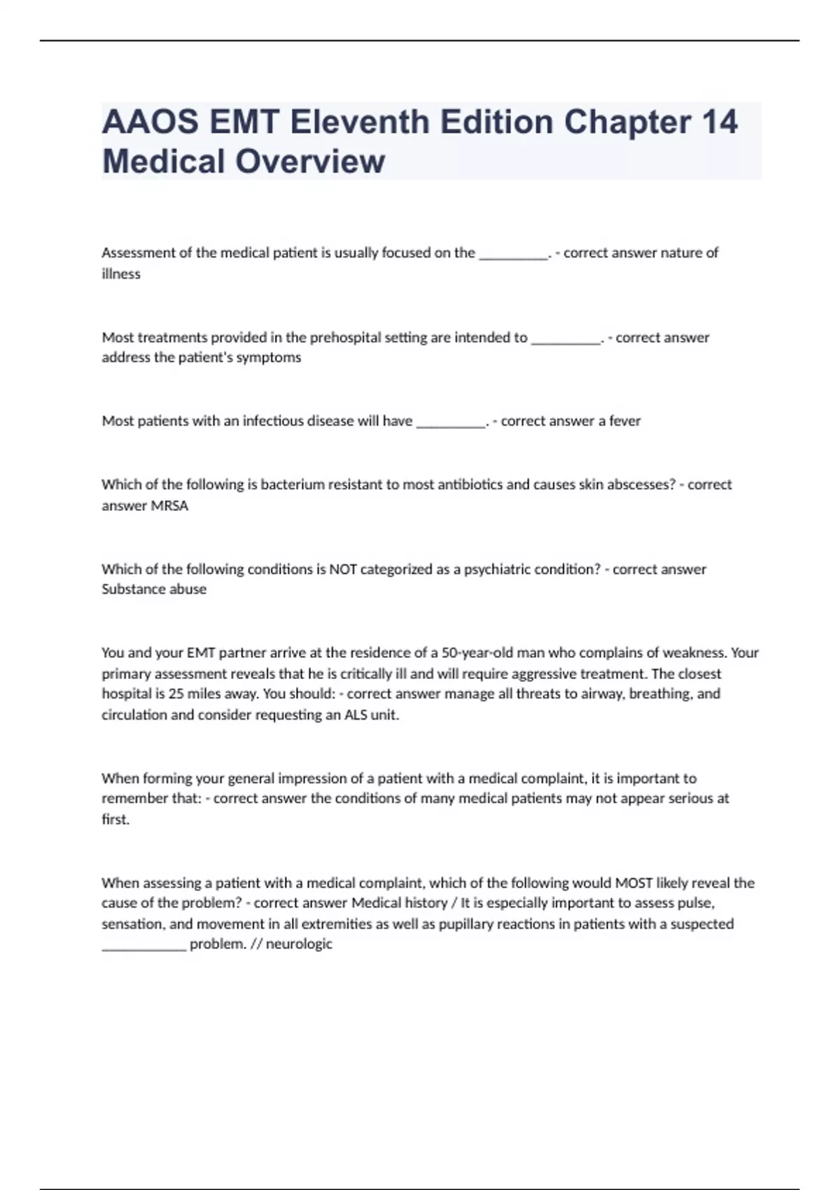 AAOS EMT Eleventh Edition Chapter 14 Medical OverviewAssessment of the medical patient is usually focused on the _________. - correct answer nature of illness Most treatments provided in the prehospital setting are intended to _________. - correct answer address the patient's symptoms Most patients with an infectious disease will have _________. - correct answer a fever Which of the following is bacterium resistant to most antibiotics and causes skin abscesses? - correct answer MRSA Which of the following conditions is NOT categorized as a psychiatric condition? - correct answer Substance abuse You and your EMT partner arrive at the residence of a 50-year-old man who complains of weakness. Your primary assessment reveals that he is critically ill and will require aggressive treatment. The closest hospital is 25 miles away. You should: - correct answer manage all threats to airway, breathing, and circulation and consider requesting an ALS unit. When forming your general impression of a patient with a medical complaint, it is important to remember that: - correct answer the conditions of many medical patients may not appear serious at first. When assessing a patient with a medical complaint, which of the following would MOST likely reveal the cause of the problem? - correct answer Medical history / It is especially important to assess pulse, sensation, and movement in all extremities as well as pupillary reactions in patients with a suspected ___________ problem. // neurologic When caring for a patient with an altered mental status and signs of circulatory compromise, you should: - correct answer limit your time at the scene to 10 minutes or less, if possible. The determination of whether a medical patient is a high-priority or low-priority transport is typically made: - correct answer after the primary assessment has been completed. In which of the following situations would it be MOST appropriate to utilize an air medical transportation service? - correct answer 61-year-old man with signs and symptoms of a stroke and a ground transport time of 50 minutes After sizing up the scene of a patient with a possible infectious disease, your next priority should be to: - correct answer take standard precautions. An infectious disease is MOST accurately defined as: - correct answer a medical condition caused by the growth and spread of small, harmful organisms within the body. Which of the following patients is at greatest risk for complications caused by the influenza virus? - correct answer 68-year-old woman with type 2 diabetes The BEST way to prevent infection from whooping cough is to: - correct answer get vaccinated against diphtheria, tetanus, and pertussis. 40. Ten days after treating a 34-year-old patient with tuberculosis, you are given a tuberculin skin test, which yields a positive result. This MOST likely indicates that: - correct answer you were exposed to another infected person prior to treating the 34-year-old patient. Hepatitis B is more virulent than hepatitis C, which means that it: - correct answer has a greater ability to produce disease. You are attending to a 27-year-old male driver of a car. According to his passenger, the patient had been acting strangely while driving, then slumped forward against the steering wheel, apparently unconscious. The car drove off the road and struck a telephone pole. The patient remains unconscious, and physical assessment reveals only a large hematoma on his right forehead with no other physical signs. Your