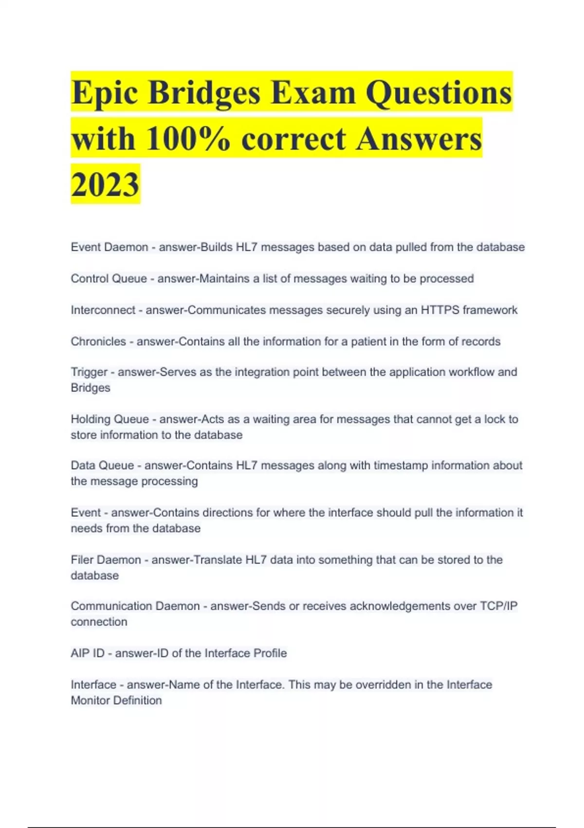 Epic Bridges Exam Questions with 100% correct Answers 2023 Event Daemon - answer-Builds HL7 messages based on data pulled from the database Control Queue - answer-Maintains a list of messages waiting to be processed Interconnect - answer-Communicates messages securely using an HTTPS framework Chronicles - answer-Contains all the information for a patient in the form of records Trigger - answer-Serves as the integration point between the application workflow and Bridges