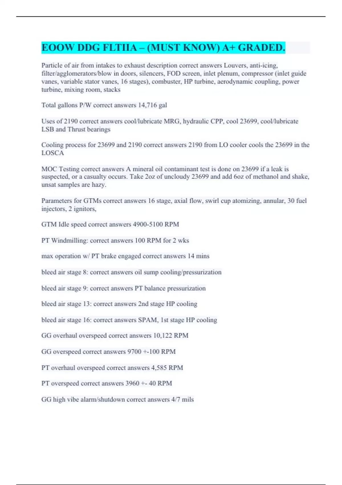 Particle of air from intakes to exhaust description correct answers Louvers, anti-icing, filter/agglomerators/blow in doors, silencers, FOD screen, inlet plenum, compressor (inlet guide vanes, variable stator vanes, 16 stages), combuster, HP turbine, aerodynamic coupling, power turbine, mixing room, stacks Total gallons P/W correct answers 14,716 gal Uses of 2190 correct answers cool/lubricate MRG, hydraulic CPP, cool 23699, cool/lubricate LSB and Thrust bearings Cooling process for 23699 and 2190 correct answers 2190 from LO cooler cools the 23699 in the LOSCA MOC Testing correct answers A mineral oil contaminant test is done on 23699 if a leak is suspected, or a casualty occurs. Take 2oz of uncloudy 23699 and add 6oz of methanol and shake, unsat samples are hazy. Parameters for GTMs correct answers 16 stage, axial flow, swirl cup atomizing, annular, 30 fuel injectors, 2 ignitors, GTM Idle speed correct answers RPM PT Windmilling: correct answers 100 RPM for 2 wks max operation w/ PT brake engaged correct answers 14 mins bleed air stage 8: correct answers oil sump cooling/pressurization bleed air stage 9: correct answers PT balance pressurization bleed air stage 13: correct answers 2nd stage HP cooling bleed air stage 16: correct answers SPAM, 1st stage HP cooling GG overhaul overspeed correct answers 10,122 RPM GG overspeed correct answers 9700 +-100 RPM PT overhaul overspeed correct answers 4,585 RPM PT overspeed correct answers 3960 +- 40 RPM GG high vibe alarm/shutdown correct answers 4/7 mils