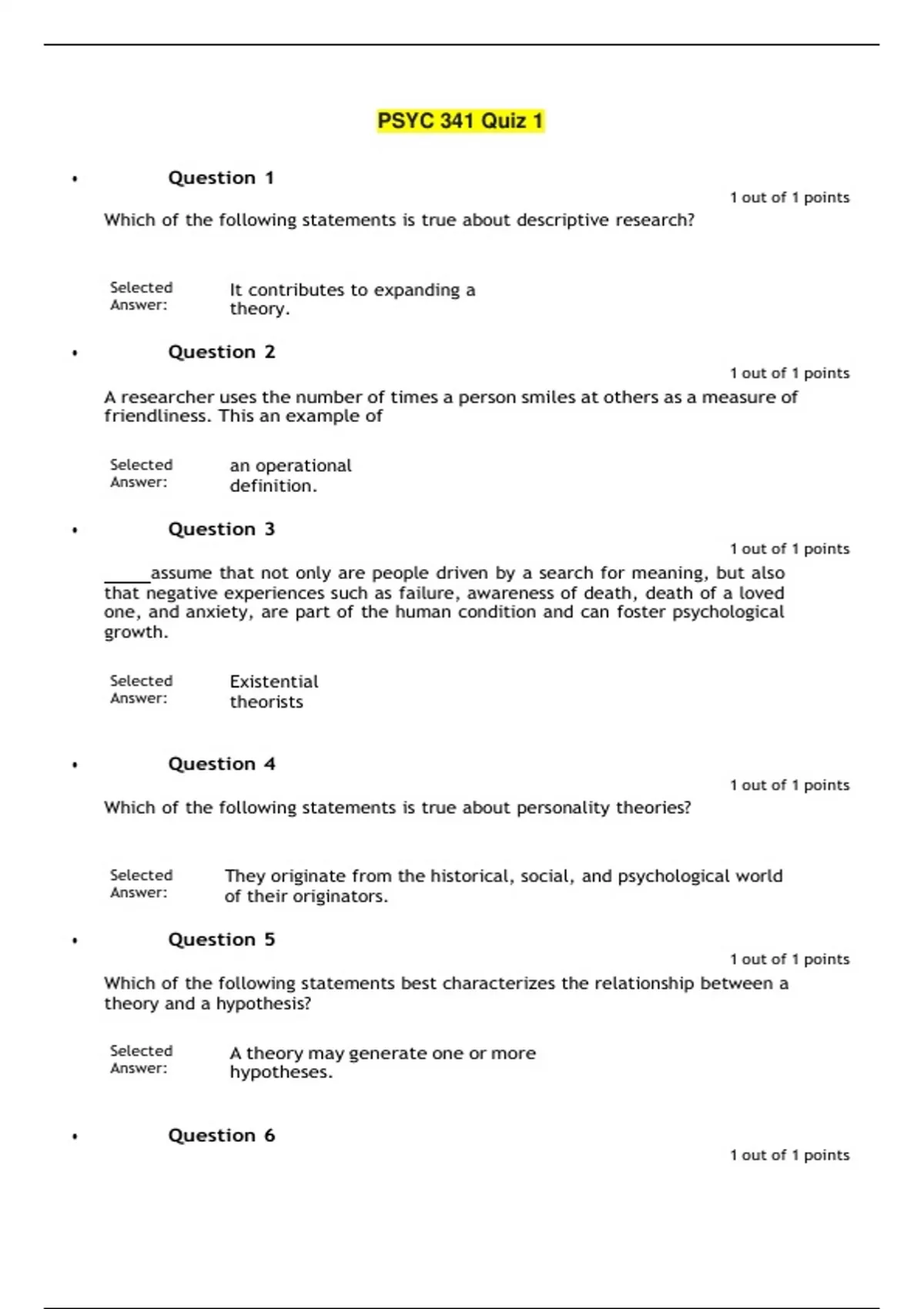 Question 1 Which of the following statements is true about descriptive research? 1 out of 1 points Selected Answer: It contributes to expanding a theory. • Question 2 1 out of 1 points A researcher uses the number of times a person smiles at others as a measure of friendliness. This an example of Selected Answer: an operational definition. • Question 3 1 out of 1 points assume that not only are people driven by a search for meaning, but also that negative experiences such as failure, awareness of death, death of a loved one, and anxiety, are part of the human condition and can foster psychological growth. Selected Answer: Existential theorists • Question 4 Which of the following statements is true about personality theories? 1 out of 1 points Selected Answer: They originate from the historical, social, and psychological world of their originators. • Question 5 1 out of 1 points Which of the following statements best characterizes the relationship between a theory and a hypothesis? Selected Answer: A theory may generate one or more hypotheses.