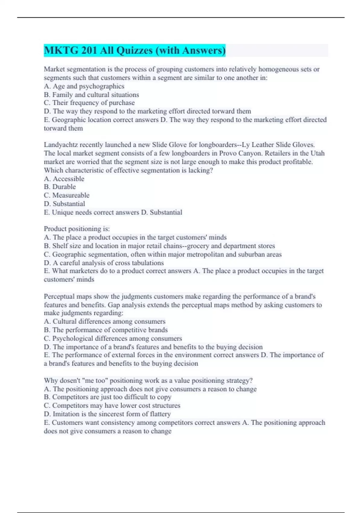 Market segmentation is the process of grouping customers into relatively homogeneous sets or segments such that customers within a segment are similar to one another in: A. Age and psychographics B. Family and cultural situations C. Their frequency of purchase D. The way they respond to the marketing effort directed torward them E. Geographic location correct answers D. The way they respond to the marketing effort directed torward them Landyachtz recently launched a new Slide Glove for longboarders--Ly Leather Slide Gloves. The local market segment consists of a few longboarders in Provo Canyon. Retailers in the Utah market are worried that the segment size is not large enough to make this product profitable. Which characteristic of effective segmentation is lacking? A. Accessible B. Durable C. Measureable D. Substantial E. Unique needs correct answers D. Substantial Product positioning is: A. The place a product occupies in the target customers' minds B. Shelf size and location in major retail chains--grocery and department stores C. Geographic segmentation, often within major metropolitan and suburban areas D. A careful analysis of cross tabulations E. What marketers do to a product correct answers A. The place a product occupies in the target customers' minds Perceptual maps show the judgments customers make regarding the performance of a brand's features and benefits. Gap analysis extends the perceptual maps method by asking customers to make judgments regarding: A. Cultural differences among consumers B. The performance of competitive brands C. Psychological differences among consumers D. The importance of a brand's features and benefits to the buying decision E. The performance of external forces in the environment correct answers D. The importance of a brand's features and benefits to the buying decision Why dosen't "me too" positioning work as a value positioning strategy? A. The positioning approach does not give consumers a reason to change B. Competitors are just too difficult to copy C. Competitors may have lower cost structures D. Imitation is the sincerest form of flattery E. Customers want consistency among competitors correct answers A. The positioning approach does not give consumers a reason to change