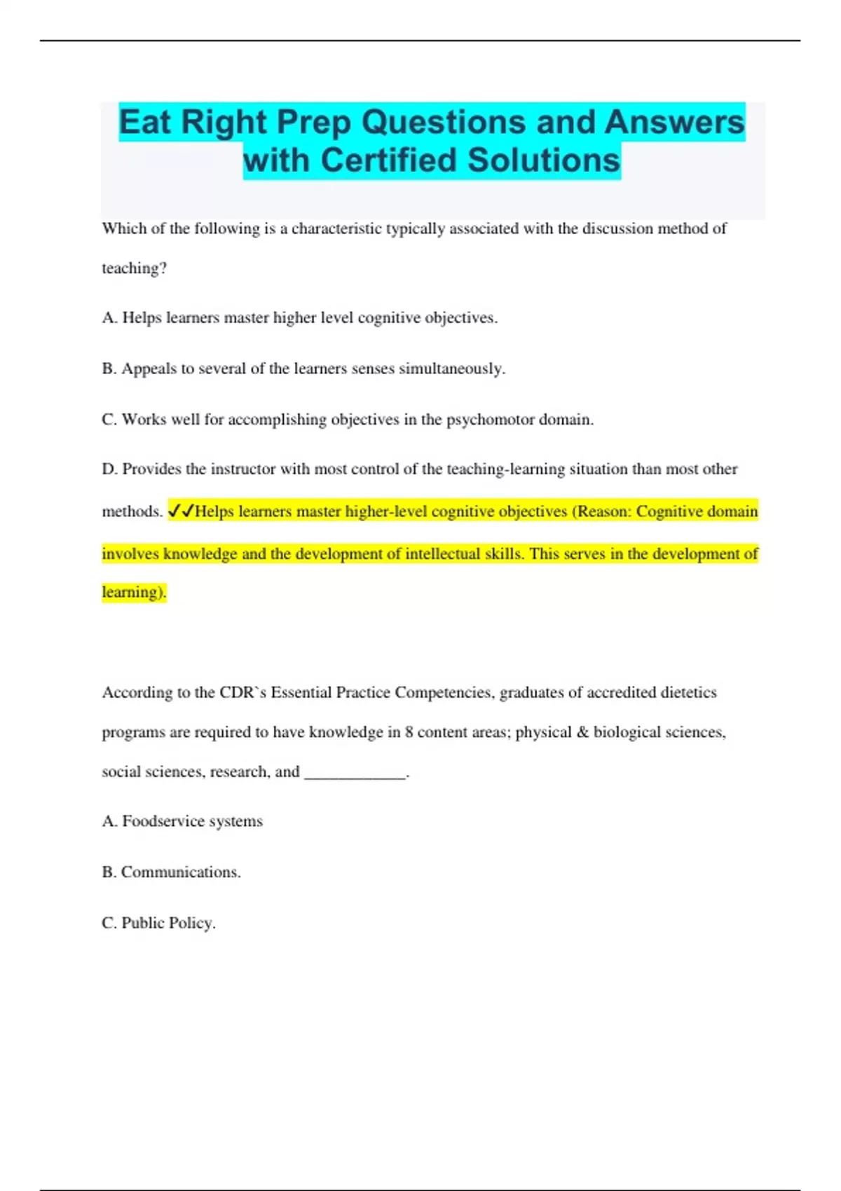 Eat Right Prep Questions and Answers with Certified Solutions Which of the following is a characteristic typically associated with the discussion method of teaching? A. Helps learners master higher level cognitive objectives. B. Appeals to several of the learners senses simultaneously. C. Works well for accomplishing objectives in the psychomotor domain. D. Provides the instructor with most control of the teaching-learning situation than most other methods. Helps learners master higher-level cognitive objectives (Reason: Cognitive domain involves knowledge and the development of intellectual skills. This serves in the development of learning). According to the CDR`s Essential Practice Competencies, graduates of accredited dietetics programs are required to have knowledge in 8 content areas; physical & biological sciences, social sciences, research, and ____________. A. Foodservice systems B. Communications. C. Public Policy. D. MNT. Communications (Reason: The variety of topics expected to be studied by an RDN professional are supported by biological, physiological, behavioral, and communication. Glycogenolysis is the breakdown of glycogen into glucose. This occurs in the cells of the _____. A. Stomach and Small Intestine. B. Liver and Muscle C. Kidney and Brain D. Small intestine and Kidney. Liver and muscle Which agency regulates the manufacturing of cream of chicken soup that contains almost no meat? A. FSIS (Food Safety and Inspection Service) B. FDA C. USDA D. USPHS (US Public Health Service). Food and Safety Inspection Service (FSIS) (Reason: This agency is responsible for the inspection of canned product manufacturing). How many kcal per oz does a standard infant formula provide? 20 kcal/oz In the Campinha-Bacote Model, cultural competence originates in the ______. A. Individual B. Family C. Community D. Society Individual What production forecasting method would be used if an assumption was made that actual occurrences follow an identifiable pattern overtime? A. Exponential smoothing B. Moving average C. Linear Regression D. Both A and B Exponential smoothing & moving average (Reason: Gregoire and Spears identified that the frequently used time series forecasting model involves the assumption that actual occurrences follow an identifiable pattern overtime). What name is given to the purchasing document that is completed by the buyer and given to the supplier? A. FOB origin B. Purchase Requisition C. Invoice D. Purchase order Purchase order Upon quarterly audit, the accountant found an error: The beginning inventory for the month of January was overstated. How would this effect the cost of goods sold (COGS) and net income for the month of January? A. The COGS for January would be MORE than it actually was, and the net income would be less than it actually was. B. The COGS for January would be LESS than it actually was, and the net income would be less than it actually was. C. The COGS for January would be MORE than it actually was, and the net income would be more than it actually was. D. The COGS for January would NOT be affected, and the net income for February would be less than it actually was. The COGS for January would be MORE than it actually was, and the net income would be LESS than it actually was. The astringent taste of F/V is the result of the following component: A. Anthocyanin B. Tannin. C. Carotene.