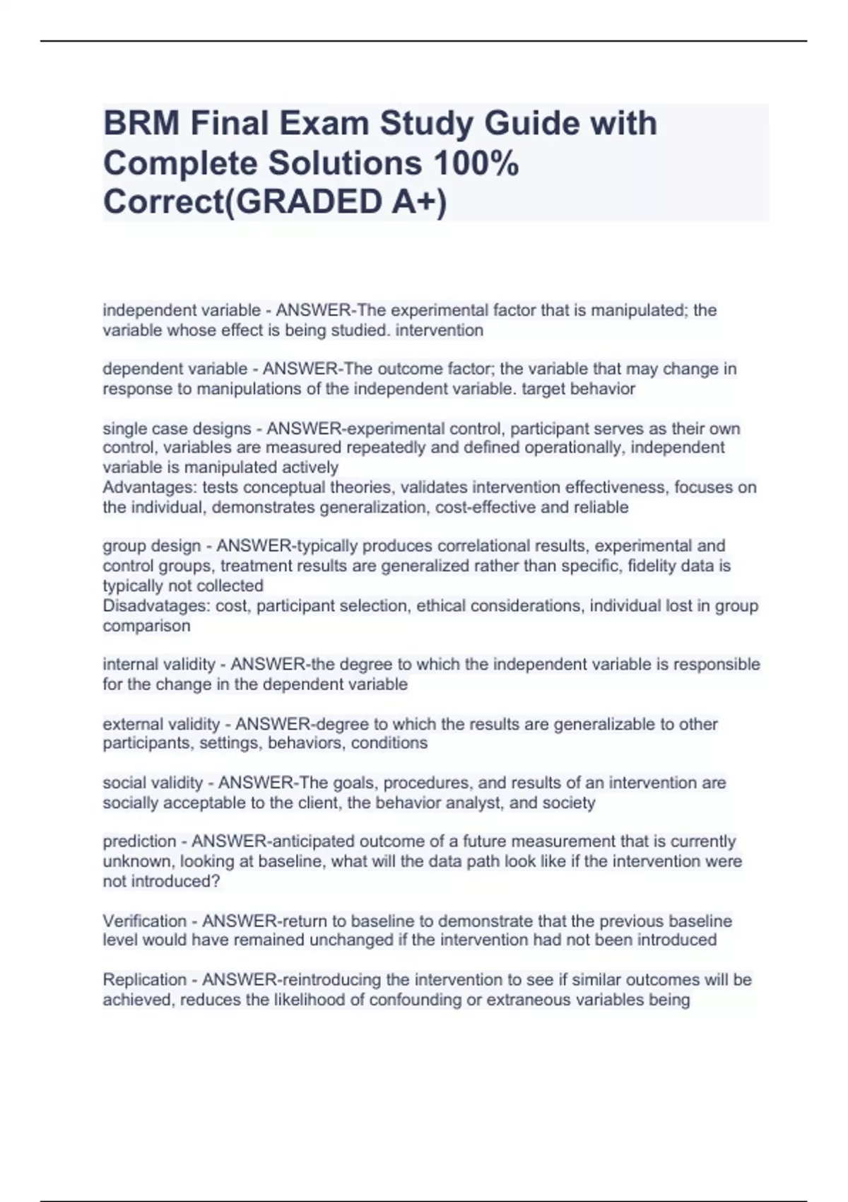 independent variable - ANSWER-The experimental factor that is manipulated; the variable whose effect is being studied. intervention dependent variable - ANSWER-The outcome factor; the variable that may change in response to manipulations of the independent variable. target behavior single case designs - ANSWER-experimental control, participant serves as their own control, variables are measured repeatedly and defined operationally, independent variable is manipulated actively Advantages: tests conceptual theories, validates intervention effectiveness, focuses on the individual, demonstrates generalization, cost-effective and reliable group design - ANSWER-typically produces correlational results, experimental and control groups, treatment results are generalized rather than specific, fidelity data is typically not collected Disadvatages: cost, participant selection, ethical considerations, individual lost in group comparison internal validity - ANSWER-the degree to which the independent variable is responsible for the change in the dependent variable external validity - ANSWER-degree to which the results are generalizable to other participants, settings, behaviors, conditions BRM Final Exam Study Guide with Complete Solutions 100% Correct(GRADED A+)