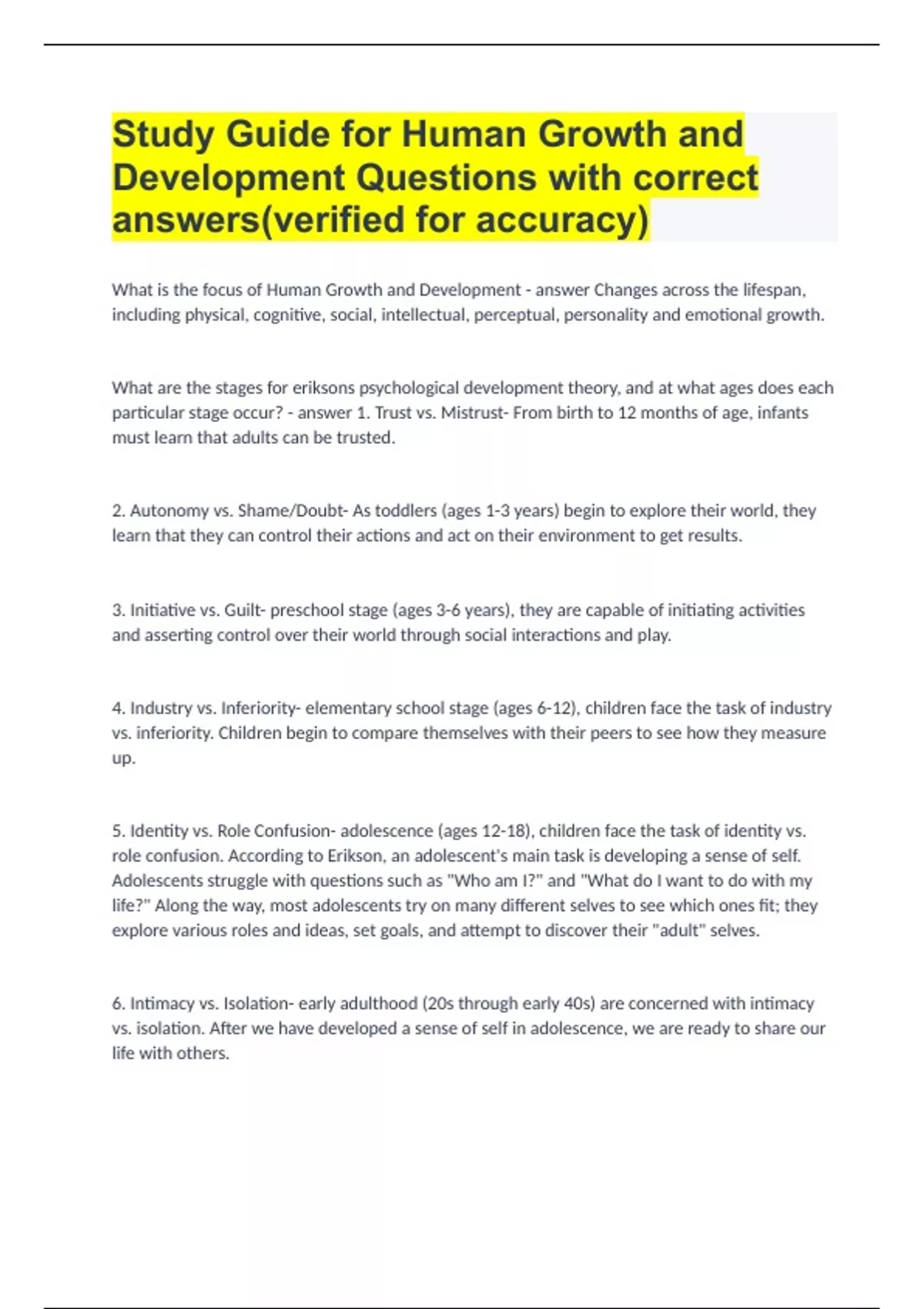 Study Guide for Human Growth and Development Questions with correct answers(verified for accuracy)