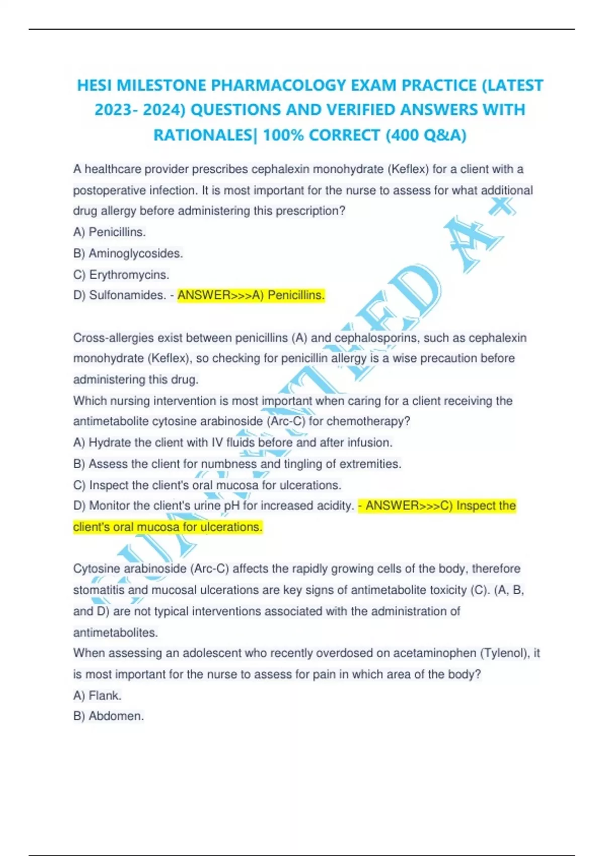 HESI MILESTONE PHARMACOLOGY EXAM PRACTICE (LATEST ) QUESTIONS AND ANSWERS