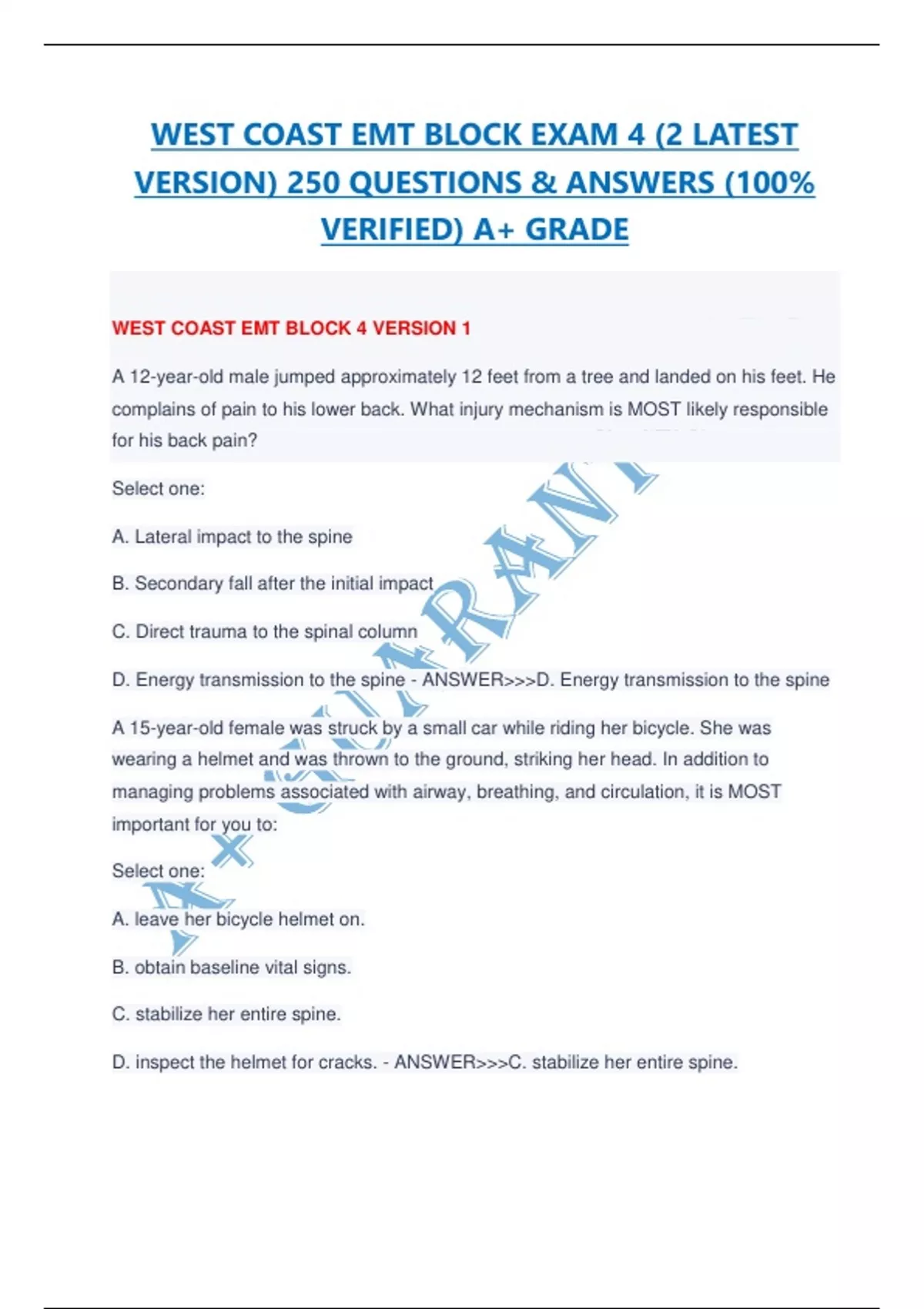 WEST COAST EMT BLOCK EXAM 4 (2 LATEST VERSION) 250 QUESTIONS & ANSWERS