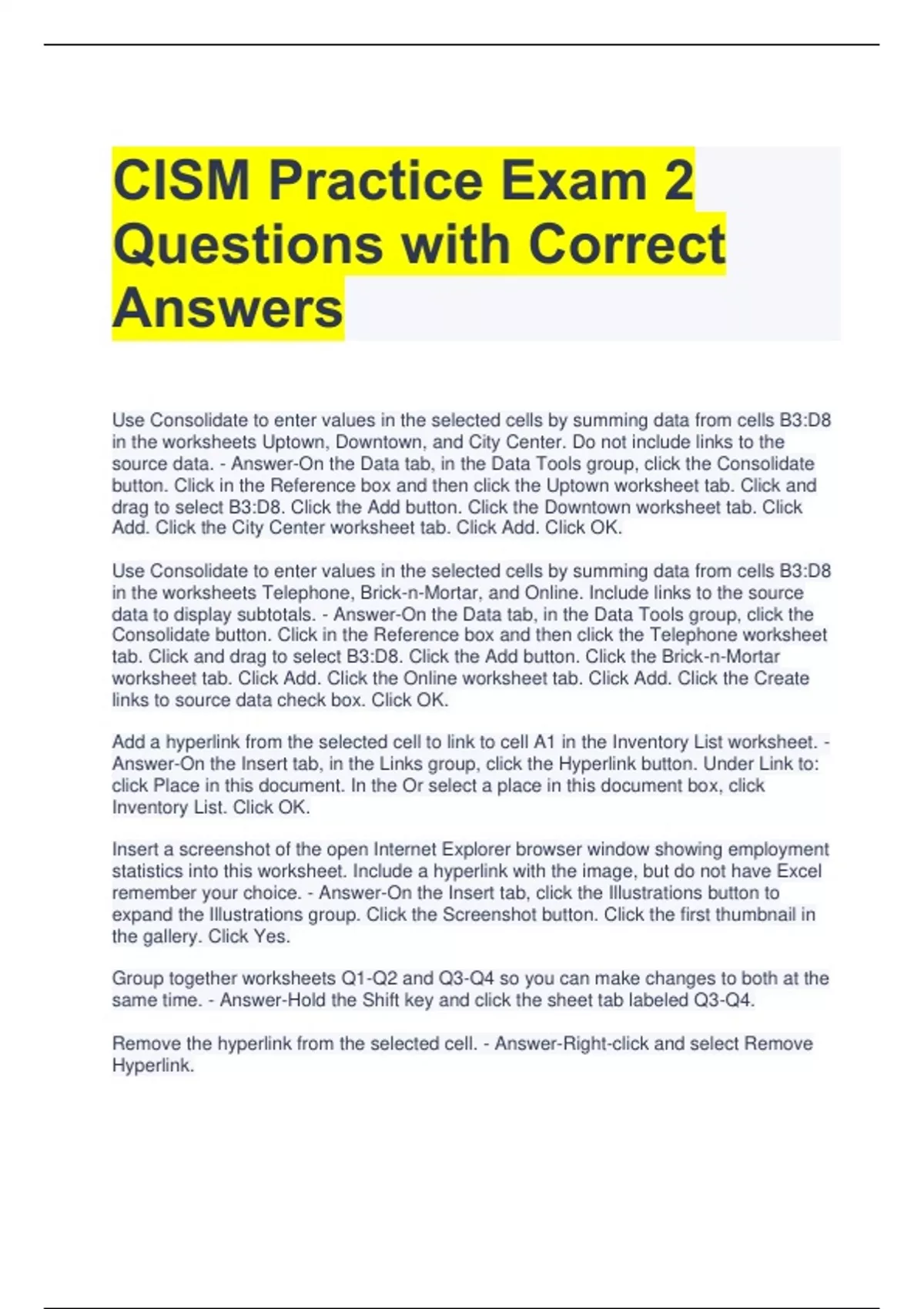 CISM Practice Exam 2 Questions with Correct Answers Use Consolidate to enter values in the selected cells by summing data from cells B3:D8 in the worksheets Uptown, Downtown, and City Center. Do not include links to the source data. - Answer-On the Data tab, in the Data Tools group, click the Consolidate button. Click in the Reference box and then click the Uptown worksheet tab. Click and drag to select B3:D8. Click the Add button. Click the Downtown worksheet tab. Click Add. Click the City Center worksheet tab. Click Add. Click OK. Use Consolidate to enter values in the selected cells by summing data from cells B3:D8 in the worksheets Telephone, Brick-n-Mortar, and Online. Include links to the source data to display subtotals. - Answer-On the Data tab, in the Data Tools group, click the Consolidate button. Click in the Reference box and then click the Telephone worksheet tab. Click and drag to select B3:D8. Click the Add button. Click the Brick-n-Mortar worksheet tab. Click Add. Click the Online worksheet tab. Click Add. Click the Create links to source data check box. Click OK. Add a hyperlink from the selected cell to link to cell A1 in the Inventory List worksheet. - Answer-On the Insert tab, in the Links group, click the Hyperlink button. Under Link to: click Place in this document. In the Or select a place in this document box, click Inventory List. Click OK. Insert a screenshot of the open Internet Explorer browser window showing employment statistics into this worksheet. Include a hyperlink with the image, but do not have Excel remember your choice. - Answer-On the Insert tab, click the Illustrations button to expand the Illustrations group. Click the Screenshot button. Click the first thumbnail in the gallery. Click Yes. Group together worksheets Q1-Q2 and Q3-Q4 so you can make changes to both at the same time. - Answer-Hold the Shift key and click the sheet tab labeled Q3-Q4. Remove the hyperlink from the selected cell. - Answer-Right-click and select Remove Hyperlink.