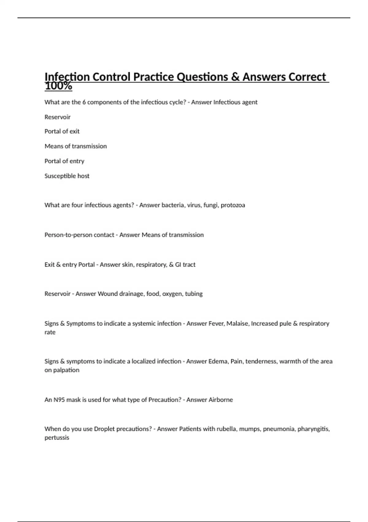 What are the 6 components of the infectious cycle? - Answer Infectious agent Reservoir Portal of exit Means of transmission Portal of entry Susceptible host What are four infectious agents? - Answer bacteria, virus, fungi, protozoa Person-to-person contact - Answer Means of transmission Exit & entry Portal - Answer skin, respiratory, & GI tract Reservoir - Answer Wound drainage, food, oxygen, tubing