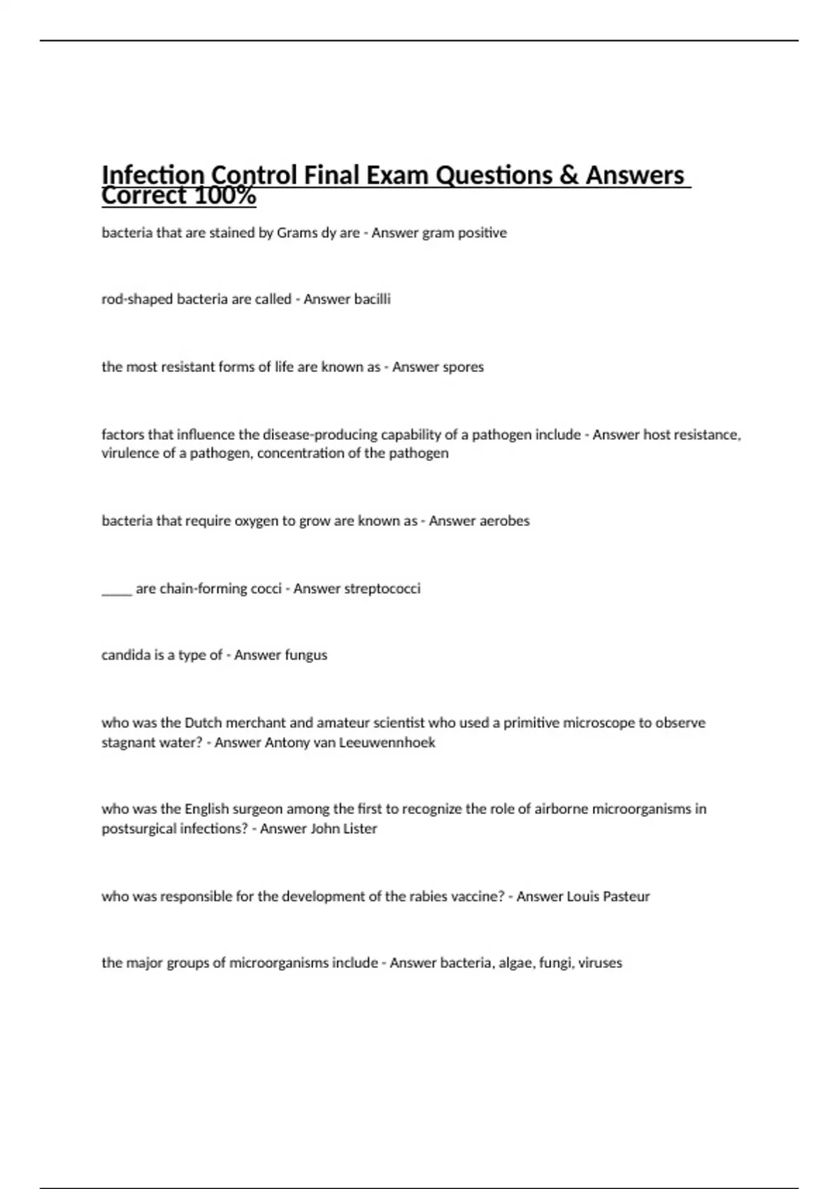 Infection Control Final Exam Questions & Answers Correct 100%