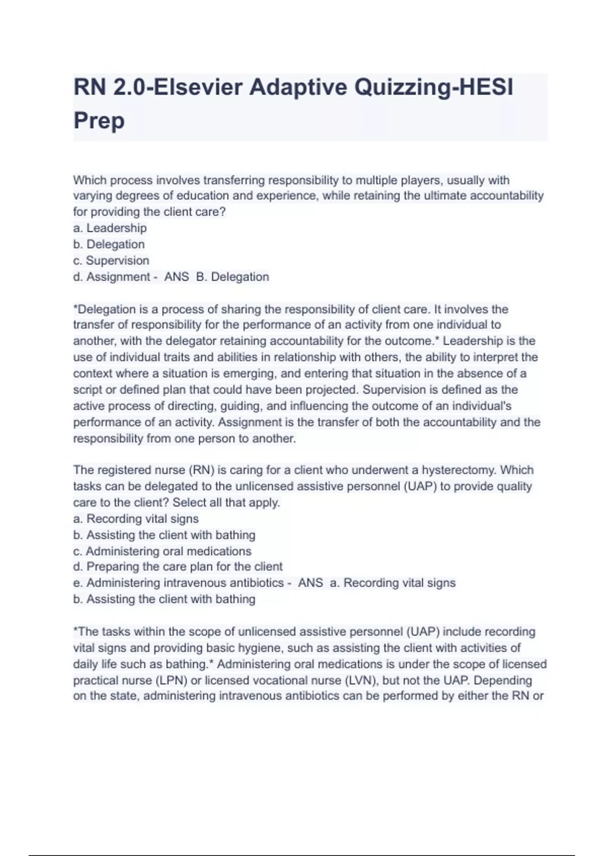 RN 2.0-Elsevier Adaptive Quizzing-HESI Prep Complete Questions With Answers All Verified Which process involves transferring responsibility to multiple players, usually with varying degrees of education and experience, while retaining the ultimate accountability for providing the client care? a. Leadership b. Delegation c. Supervision d. Assignment - ANS B. Delegation *Delegation is a process of sharing the responsibility of client care. It involves the transfer of responsibility for the performance of an activity from one individual to another, with the delegator retaining accountability for the outcome.* Leadership is the use of individual traits and abilities in relationship with others, the ability to interpret the context where a situation is emerging, and entering that situation in the absence of a script or defined plan that could have been projected. Supervision is defined as the active process of directing, guiding, and influencing the outcome of an individual's performance of an activity. Assignment is the transfer of both the accountability and the responsibility from one person to another. The registered nurse (RN) is caring for a client who underwent a hysterectomy. Which tasks can be delegated to the unlicensed assistive personnel (UAP) to provide quality care to the client? Select all that apply. a. Recording vital signs b. Assisting the client with bathing c. Administering oral medications d. Preparing the care plan for the client e. Administering intravenous antibiotics - ANS a. Recording vital signs b. Assisting the client with bathing *The tasks within the scope of unlicensed assistive personnel (UAP) include recording vital signs and providing basic hygiene, such as assisting the client with activities of daily life such as bathing.* Administering oral medications is under the scope of licensed practical nurse (LPN) or licensed vocational nurse (LVN), but not the UAP. Depending on the state, administering intravenous antibiotics can be performed by either the RN or an LPN/LVN. Preparing the care plan for the client should be performed by the registered nurse only. What is the ultimate goal of delegation? a. To deliver patient care as a team b. To maximize patient care outcomes c. To improve the working ability of the nurse d. To maintain open lines of communication between delegator and the delegate - ANS b. To maximize patient care outcomes *The ultimate goal of the delegation is to maximize patient care outcomes.* Delegation helps to deliver patient care as a team and improves the working ability of the nurse but these are not the ultimate goals of delegation. Maintaining open lines of communication between delegator and the delegatee creates a productive work environment in delivering patient care. Which member of the health care team is accountable for initial assessment and ongoing evaluation of client care? a. Registered nurse b. Licensed practical nurse c. Primary health care provider d. Unlicensed nursing personnel - ANS a. Registered nurse