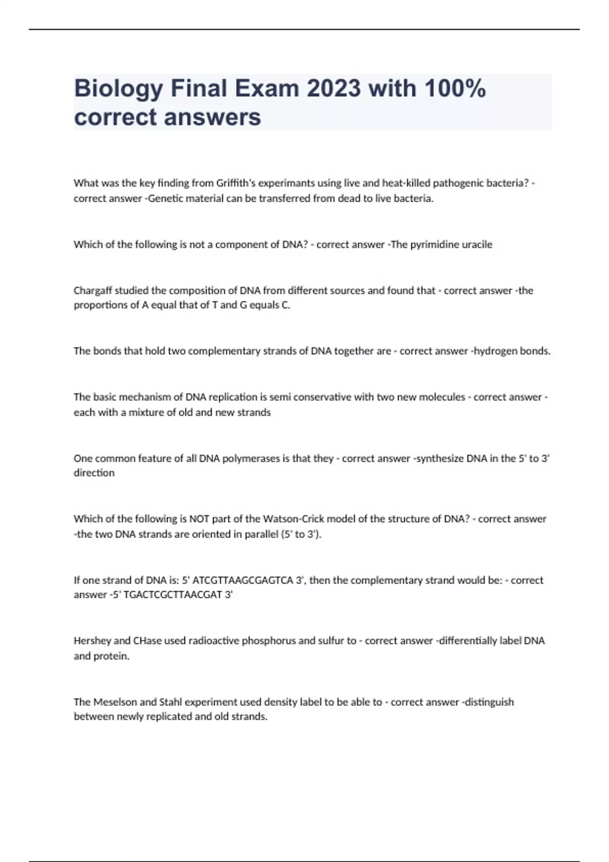 What was the key finding from Griffith's experimants using live and heat-killed pathogenic bacteria? - correct answer -Genetic material can be transferred from dead to live bacteria. Which of the following is not a component of DNA? - correct answer -The pyrimidine uracile Chargaff studied the composition of DNA from different sources and found that - correct answer -the proportions of A equal that of T and G equals C. The bonds that hold two complementary strands of DNA together are - correct answer -hydrogen bonds. The basic mechanism of DNA replication is semi conservative with two new molecules - correct answer -each with a mixture of old and new strands One common feature of all DNA polymerases is that they - correct answer -synthesize DNA in the 5' to 3' direction Which of the following is NOT part of the Watson-Crick model of the structure of DNA? - correct answer -the two DNA strands are oriented in parallel (5' to 3'). If one strand of DNA is: 5' ATCGTTAAGCGAGTCA 3', then the complementary strand would be: - correct answer -5' TGACTCGCTTAACGAT 3' Hershey and CHase used radioactive phosphorus and sulfur to - correct answer -differentially label DNA and protein. The Meselson and Stahl experiment used density label to be able to - correct answer -distinguish between newly replicated and old strands. The difference in leading- versus lagging-strand synthesis is a consequence of - correct answer -both the physical structure of DNA and the action of polymerase enzyme. If the activity of DNA ligase was removed from replication, this would have a greater affect on - correct answer -s