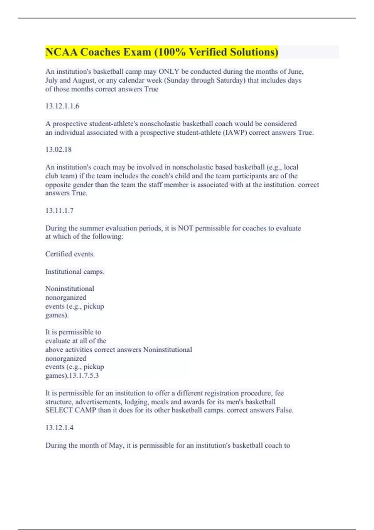 An institution's basketball camp may ONLY be conducted during the months of June, July and August, or any calendar week (Sunday through Saturday) that includes days of those months correct answers True 13.12.1.1.6 A prospective student-athlete's nonscholastic basketball coach would be considered an individual associated with a prospective student-athlete (IAWP) correct answers True. 13.02.18 An institution's coach may be involved in nonscholastic based basketball (e.g., local club team) if the team includes the coach's child and the team participants are of the opposite gender than the team the staff member is associated with at the institution. correct answers True. 13.11.1.7 During the summer evaluation periods, it is NOT permissible for coaches to evaluate at which of the following: Certified events. Institutional camps. Noninstitutional nonorganized events (e.g., pickup games). It is permissible to evaluate at all of the above activities correct answers Noninstitutional nonorganized events (e.g., pickup games).13.1.7.5.3 It is permissible for an institution to offer a different registration procedure, fee structure, advertisements, lodging, meals and awards for its men's basketball SELECT CAMP than it does for its other basketball camps. correct answers False. 13.12.1.4 During the month of May, it is permissible for an institution's basketball coach to