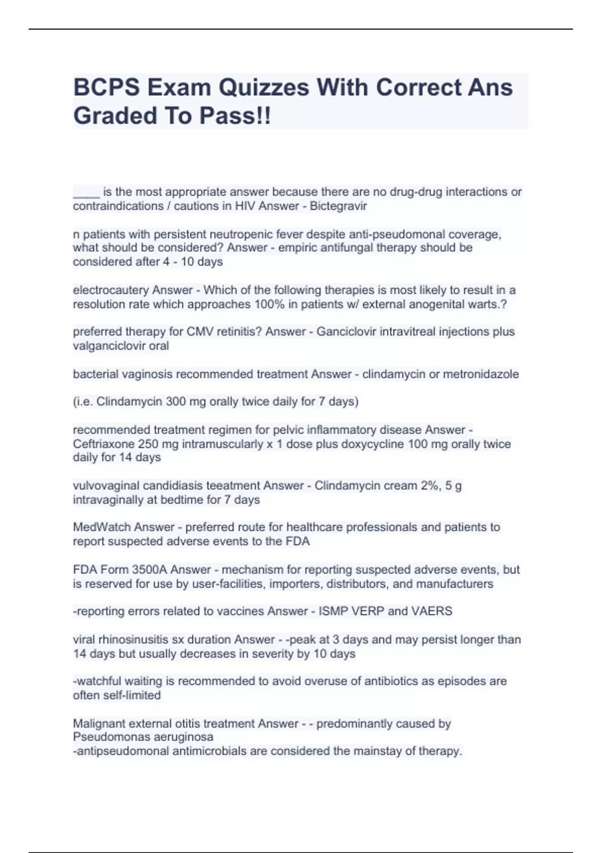 bcps exam quizzes with correct ans graded to pass