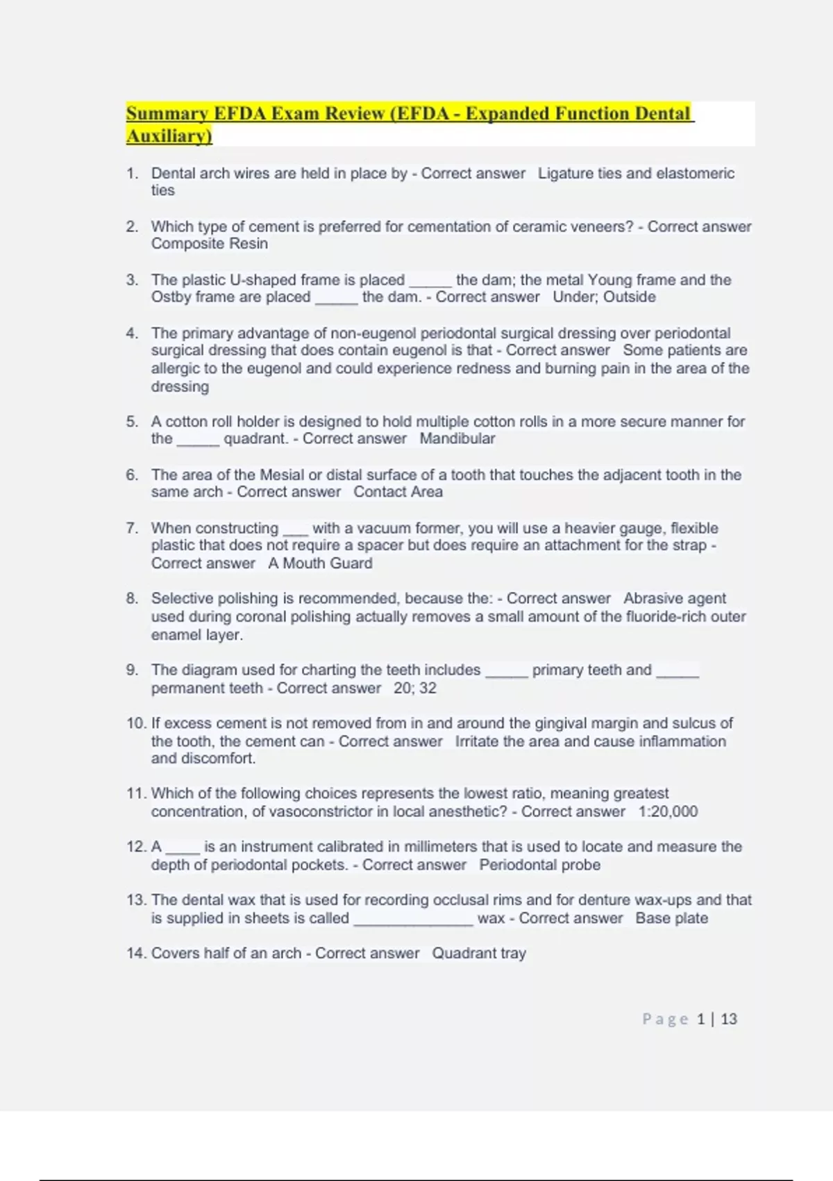 Summary EFDA Exam Review (EFDA - Expanded Function Dental Auxiliary)Summary EFDA Exam Review (EFDA - Expanded Function Dental Auxiliary)Summary EFDA Exam Review (EFDA - Expanded Function Dental Auxiliary)Summary EFDA Exam Review (EFDA - Expanded Function Dental Auxiliary)