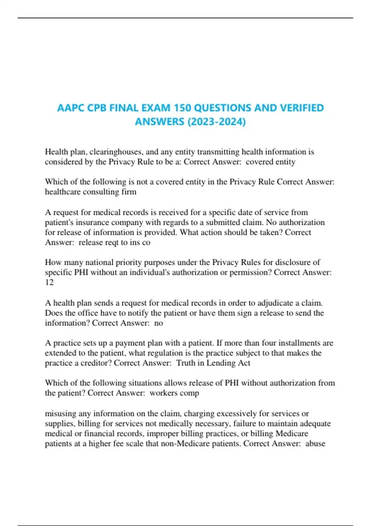 AAPC CPB FINAL EXAM 150 QUESTIONS AND VERIFIED ANSWERS ()