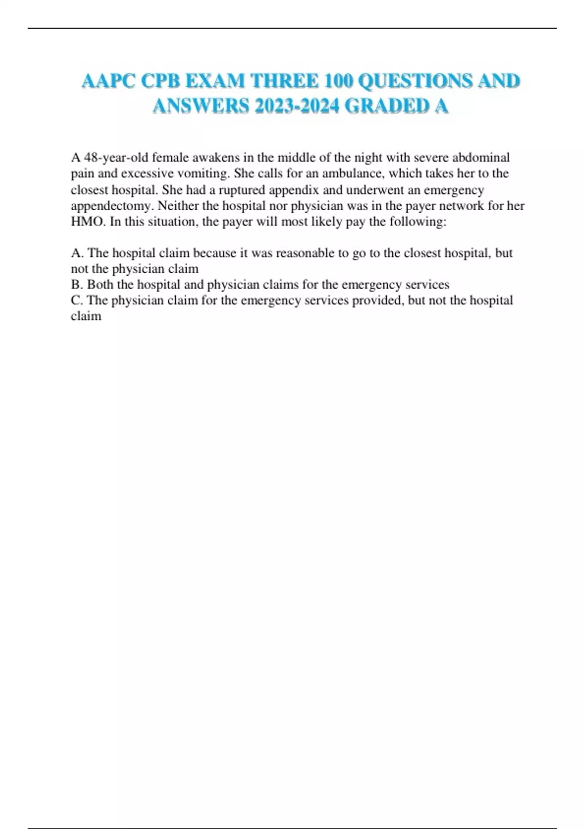 AAPC CPB EXAM THREE 100 QUESTIONS AND ANSWERS GRADED A.