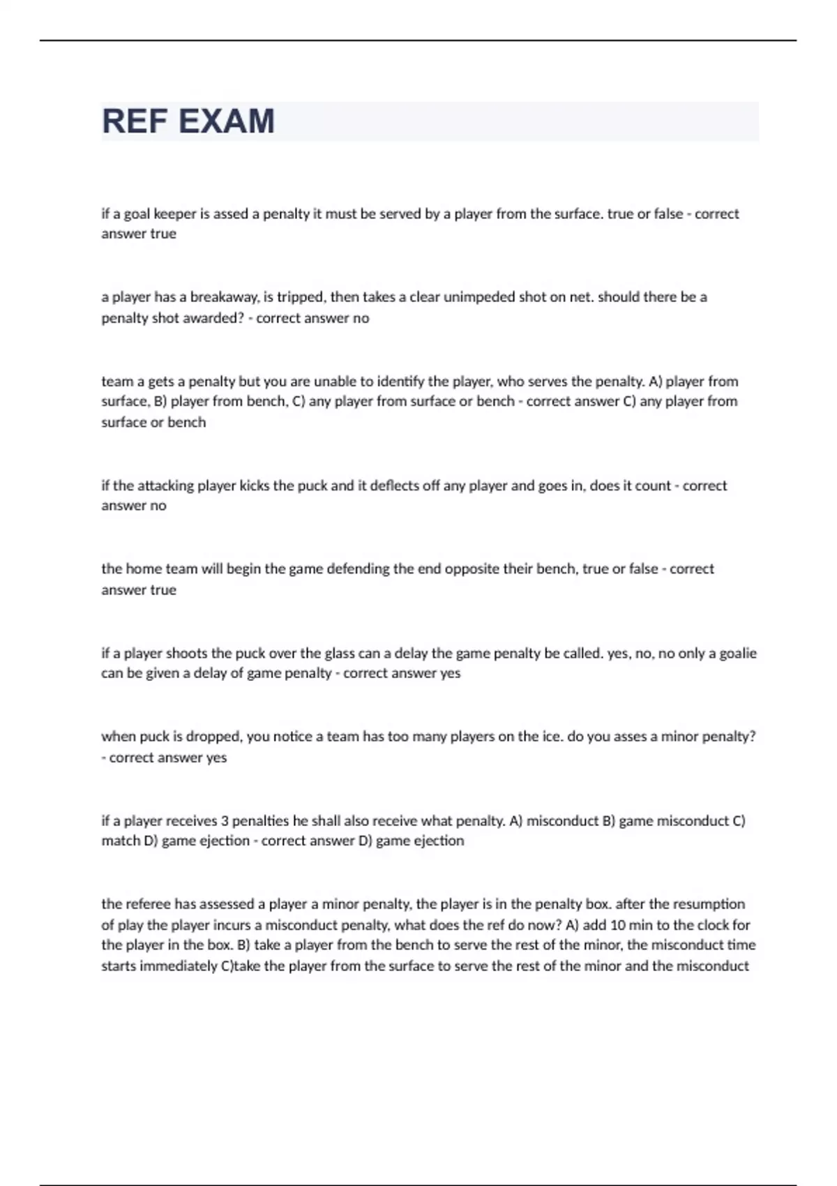 REF EXAMif a goal keeper is assed a penalty it must be served by a player from the surface. true or false true a player has a breakaway, is tripped, then takes a clear unimpeded shot on net. should there be a penalty shot awarded? no team a gets a penalty but you are unable to identify the player, who serves the penalty. A) player from surface, B) player from bench, C) any player from surface or bench C) any player from surface or bench if the attacking player kicks the puck and it deflects off any player and goes in, does it count no the home team will begin the game defending the end opposite their bench, true or false true if a player shoots the puck over the glass can a delay the game penalty be called. yes, no, no only a goalie can be given a delay of game penalty yes when puck is dropped, you notice a team has too many players on the ice. do you asses a minor penalty? yes if a player receives 3 penalties he shall also receive what penalty. A) misconduct B) game misconduct C) match D) game ejection D) game ejection the referee has assessed a player a minor penalty, the player is in the penalty box. after the resumption of play the player incurs a misconduct penalty, what does the ref do now? A) add 10 min to the clock for the player in the box. B) take a player from the bench to serve the rest of the minor, the misconduct time starts immediately C)take the player from the surface to serve the rest of the minor and the misconduct time starts immediately D) take a player from the surface to serve the rest of the minor and the misconduct time starts at the expiration of the minork the ref signals a delayed double minor penalty for spearing against team A. team B scores a goal before the referee stops the play to asses the penalty, what action does the referee take. A)wash out both minor penalties, B) assess both minor penalties C) wash out the first penalty and assess the second minor penalty D) asses a match penalty for spearing D while killing a penalty player from team A shoots the puck over the boards/glass with clear intent of stopping play, what should the ref do? A) a warning B) award penalty shot C) do nothing D) assess minor penalty for delay of game D a goal is scored deflecting off a player skate in the crease, the player did not intentionally direct the puck or interfere with the movement of the goalie, which is the refs decision. A) goal counts B) goal disallowed, faceoff at centre C) goal disallowed penalty to player in crease D) goal counts, penalty to player in crease A can a player be assessed a minor penalty for hooking an opponents stick. yes or no no