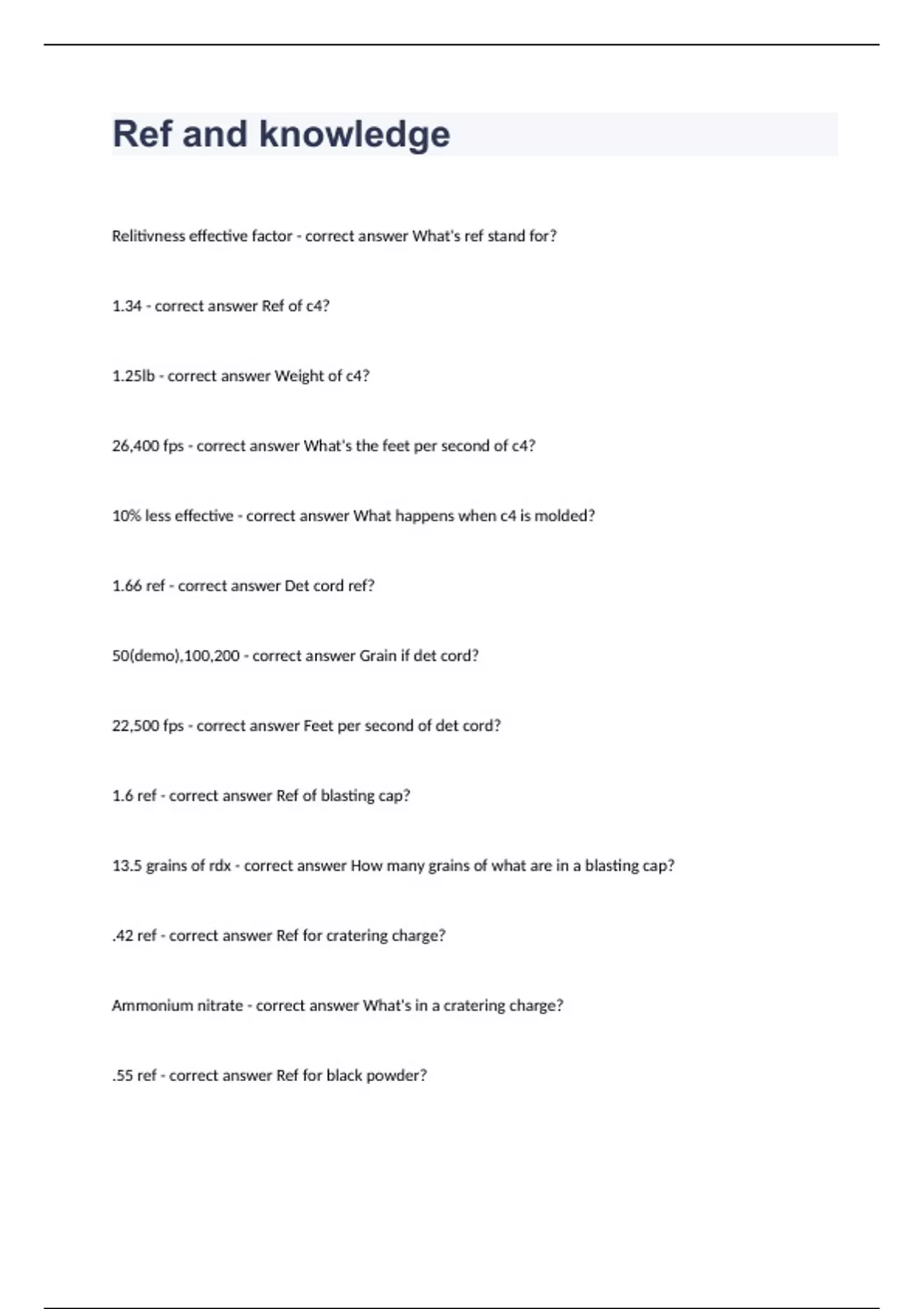 Ref and knowledgeRelitivness effective factor What's ref stand for? 1.34 Ref of c4? 1.25lb Weight of c4? 26,400 fps What's the feet per second of c4? 10% less effective What happens when c4 is molded? 1.66 ref Det cord ref? 50(demo),100,200 Grain if det cord? 22,500 fps Feet per second of det cord? 1.6 ref Ref of blasting cap? 13.5 grains of rdx How many grains of what are in a blasting cap? .42 ref Ref for cratering charge? Ammonium nitrate What's in a cratering charge? .55 ref Ref for black powder? Time fuse What's black powder used for? 1.5 ref Ref for flex liner ? 1.5 ref Ref for Nitro glycerin ? 1.36 ref Ref for Comp b4? Grenade and a-pov What's comp b4 in? 1.14 ref Ref of Comp b? 1.2 ref Ref of tetratoil? 1.17 ref Ref of a Bangalore ? 10.5lb of comp b and .5lb of a3 booster on each end. And metal weighs 3.5lb What's in a Bangalore and how much? 1.17 ref Ref for shape charge? Comp b What's in a shape charge? Monroe effect What effect does a shape charge create? 1.14 ref Ref of a Data sheet? Petn What's in a data sheet? 1 ref Ref of tnt? .92 ref Ref of Dynamite? Rdx booster What's inside dynamite?
