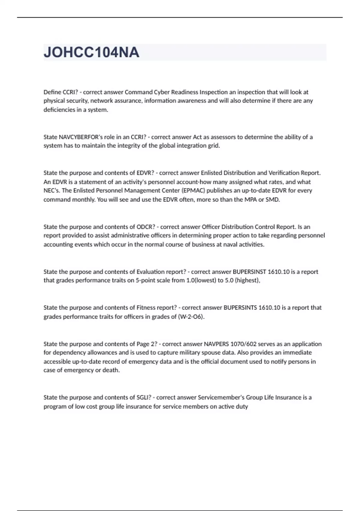 JOHCC104NADefine CCRI? Command Cyber Readiness Inspection an inspection that will look at physical security, network assurance, information awareness and will also determine if there are any deficiencies in a system. State NAVCYBERFOR's role in an CCRI? Act as assessors to determine the ability of a system has to maintain the integrity of the global integration grid. State the purpose and contents of EDVR? Enlisted Distribution and Verification Report. An EDVR is a statement of an activity's personnel account-how many assigned what rates, and what NEC's. The Enlisted Personnel Management Center (EPMAC) publishes an up-to-date EDVR for every command monthly. You will see and use the EDVR often, more so than the MPA or SMD. State the purpose and contents of ODCR? Officer Distribution Control Report. Is an report provided to assist administrative officers in determining proper action to take regarding personnel accounting events which occur in the normal course of business at naval activities. State the purpose and contents of Evaluation report? BUPERSINST 1610.10 is a report that grades performance traits on 5-point scale from 1.0(lowest) to 5.0 (highest), State the purpose and contents of Fitness report? BUPERSINTS 1610.10 is a report that grades performance traits for officers in grades of (W-2-O6). State the purpose and contents of Page 2? NAVPERS 1070/602 serves as an application for dependency allowances and is used to capture military spouse data. Also provides an immediate accessible up-to-date record of emergency data and is the official document used to notify persons in case of emergency or death. State the purpose and contents of SGLI? Servicemember's Group Life Insurance is a program of low cost group life insurance for service members on active duty State the purpose and contents of Page 13? NAVPERS 1070/613 Administrative Remarks services as a chronological record of significant miscellaneous entries which are not provided for elsewhere or where more detailed information may be required to clarify entries on other pages of the U.S. Navy Enlisted (Field) Service Record (FSR). Describe the purpose and categories of an SITREP. 1. OPREP-3 SIR (SERIOUS INCIDENT REPORT) This report provides the Commandant of the Marine Corps, through the Marine Corps Operations Center (MCOC), information on any significant event or incident that is not of national-level interest or otherwise reported under another flag word. 2. OPREP-3 Pinnacle Is to report any event or incident of national-level Interest not reported under any other flag word.