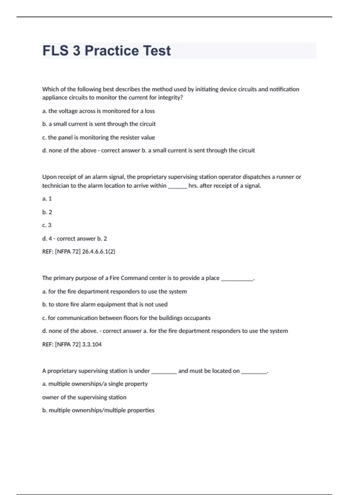 FLS 3 Practice TestWhich of the following best describes the method used by initiating device circuits and notification appliance circuits to monitor the current for integrity? a. the voltage across is monitored for a loss b. a small current is sent through the circuit c. the panel is monitoring the resister value d. none of the above b. a small current is sent through the circuit Upon receipt of an alarm signal, the proprietary supervising station operator dispatches a runner or technician to the alarm location to arrive within ______ hrs. after receipt of a signal. a. 1 b. 2 c. 3 d. 4 b. 2 REF: [NFPA 72] 26.4.6.6.1(2) The primary purpose of a Fire Command center is to provide a place __________. a. for the fire department responders to use the system b. to store fire alarm equipment that is not used c. for communication between floors for the buildings occupants d. none of the above. a. for the fire department responders to use the system REF: [NFPA 72] 3.3.104 A proprietary supervising station is under ________ and must be located on ________. a. multiple ownerships/a single property owner of the supervising station b. multiple ownerships/multiple properties c. single ownership/ property owned by any party d. single ownership/property owned by the owner of the supervising station e. none of these d. single ownership/property owned by the owner of the supervising station REF: [NFPA 72] 3.3.280.2 The maximum ceiling temperature for an Ordinary Temperature classified heat-sensing fire detector shall be a. 115 deg. F b. 100 deg. F c. 150 deg. F d. 120 deg. F a. 115 deg. F REF: [NFPA 72] 17.6.2.1 Egress doors must unlock __________. a. upon actuation of all signals of a fire alarm system b. when an alarm signal is actuated c. in the event of a break-in d. none of these b. when an alarm signal is actuated REF: [NFPA 72] 21.9.1 / 21.9.5 / 21.9.6 The subscriber shall surrender expired or cancelled documentation to the prime contractor within ___days of the termination date of central station service. a. 15 b. 60 c. 45 d. 30 d. 30 REF: [NFPA 72] 26.3.4.8 Following fire alarm system inspections, tests and maintenance, it is required to _________. a. fill out a Record of Completion b. fill out an Inspection, Testing and Maintenance form c. inform the AHJ d. sign the Certificate of Occupancy e. None of these b. fill out an Inspection, Testing and Maintenance form REF: [NFPA 72] 7.6.6 Unless specifically designed and listed for the expected conditions, smoke detectors shall not be installed if any one of the following ambient conditions exist. a. Temperature below 32 degrees C b. Temperature below 32 degrees F c. Temperature above 100 degrees C d. Relative humidty below 93 percent b. Temperature below 32 degrees F REF: (NFPA 72) 17.7.1.8 A central station fire alarm system must have a secondary power supply with a capacity of ______ hours of standby and 5 minutes of alarm. a. 12 b. 18 c. 24 d. 36 c. 24 REF: [NFPA 72] 10.6.7.2.1 A fire alarm system usually supervises a dry pipe sprinkler systems for which of the following conditions? a. air pressure b. room temperature c. water level d. none of these a. air pressure REF: [NFPA 72] 17.16.2.2.2 (A) If 3V is applied across a resistor of 9 ohms, how many watts of power does the resistor dissipate? a. 27 W b. 3 W c. 1W d. 9W c. 1W