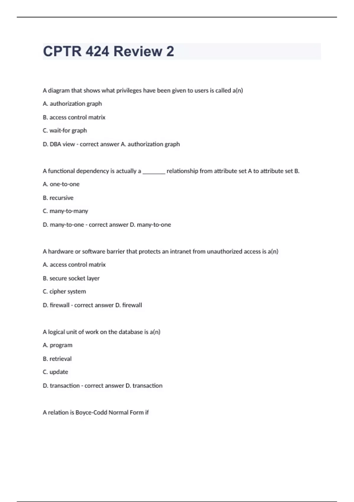 CPTR 424 Review 2A diagram that shows what privileges have been given to users is called a(n) A. authorization graph B. access control matrix C. wait-for graph D. DBA view A. authorization graph A functional dependency is actually a _______ relationship from attribute set A to attribute set B. A. one-to-one B. recursive C. many-to-many D. many-to-one D. many-to-one A hardware or software barrier that protects an intranet from unauthorized access is a(n) A. access control matrix B. secure socket layer C. cipher system D. firewall D. firewall A logical unit of work on the database is a(n) A. program B. retrieval C. update D. transaction D. transaction A relation is Boyce-Codd Normal Form if A. every superkey is a candidate key B. every determinant is a superkey C. every candidate key is a primary key D. it has overlapping candidate keys B. every determinant is a superkey A relation is in _______ normal form (1NF) if, and only if, every attribute is single-valued for each tuple. A. first B. second C. third D. Boyce-Codd A. first A situation when node or line failure causes a network to be split into groups with no inter-group communication is called A. network failure B. network replication C. network synchronization D. network partitioning D. network partitioning A unidirectional or bidirectional relationship between mutually independent classes in UML diagrams is called A. aggregation B. linking C. association D. reflexive relationship C. association A user view in which the WHERE line of the SELECT statement used to create the view contains some predicate is called A. value-dependent B. value-independent C. dynamic D. static A. value-dependent All of the following are factors the designer of a distributed database should consider EXCEPT A. data placement B. types of applications C. type of user interface D. type of communication system C. type of user interface All of the following are reasons for leaving a schema in a lower normal form except A. Desire to keep related items together in the same relation B. Performance requirements C. Desire to preserve functional dependencies in the same relation D. Desire to reduce replication D. Desire to reduce replication All of the following are used as multiplicity indicators in UML except A. 1 B. M C. 0..1 D. 0..* B. M All of the following signal an end of an Oracle transaction EXCEPT A. a COMMIT statement B. a SAVEPOINT C. a ROLLBACK statement D. a DDL command B. a SAVEPOINT An access control matrix is a means of implementing A. authorization B. authentication C. integrity checking D. database constraints A. authorization An assumption for the three-phase commit protocol for transaction management in distributed database systems is that A. at least half the nodes are operational B. there is no network partitioning C. the coordinator has not failed D. no node has failed B. there is no network partitioning Assume we have a type hierarchy in Oracle with PersonType as the base type, EmployeeType as a subtype of PersonType, and ProgrammerType as a subtype of EmployeeType. All objects are stored in a substitutable table called Persons. To limit a query to the base type, Person, without including Employees, use A. SELECT VALUE(p) FROM Persons p; B. SELECT VALUE(p) FROM Persons p WHERE value(p) IS OF (PersonType); C. SELECT PersonType(p) FROM Persons p ; D. SELECT VALUE(p) FROM Persons p WHERE value(p) IS OF (ONLY PersonType); D. SELECT VALUE(p) FROM Persons p WHERE value(p) IS OF (ONLY PersonType); At a checkpoint, all of the following operations are performed except A. writing all log records from main memory to disk B. writing all modified database buffer blocks to disk C. writing a record identifying all transactions that committed since the last checkpoint D. writing a checkpoint record identifying all active transactions C. writing a record identifying all transactions that committed since the last checkpoint Deadlock detection in a distributed environment requires A. a resource allocation graph B. a conflict resolution graph C. a query tree D. a global wait-for graph D. a global wait-for graph Deadlock occurs when A. two transactions share read locks B. two transactions each wait for a lock held by the other C. a transaction waits for another to release an exclusive lock D. a transaction waits for another to release a shared lock B. two transactions each wait for a lock held by the other For a relational decomposition, the property of being able to get back exactly the original relation by joins is A. lossless decomposition B. dependency preservation C. attribute preservation D. relation preservation A. lossless decomposition For a schedule to be serializable it must A. performs transactions serially B. not allow two transactions any type of concurrent access to the same data items C. produce the same result as an actual serial execution D. lock the data items required by each transaction C. produce the same result as an actual serial execution If a relation is 3NF but not BCNF, it must have a non-trivial functional dependency X → A such that A. the primary key does not determine X B. X is not a superkey C. A is not a superkey D. the primary key does not determine A B. X is not a superkey If set S{A,B,C} is a candidate key for the relation R(A,B,C,D,E), then which of the following must be true A. {A,B,D} must also be a candidate key for R B. {A,B} or {A,C} or {B,C} must also be a candidate key for R C. {A,B,C,D} must also be a candidate key for R D. none of these D. none of these