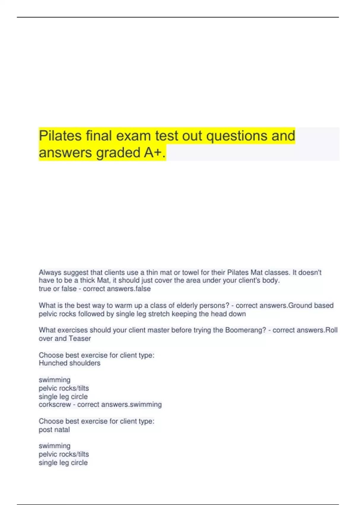 Pilates final exam test out questions and answers graded A+. Always suggest that clients use a thin mat or towel for their Pilates Mat classes. It doesn't have to be a thick Mat, it should just cover the area under your client's body. true or false - correct What is the best way to warm up a class of elderly persons? - correct answers.Ground based pelvic rocks followed by single leg stretch keeping the head down What exercises should your client master before trying the Boomerang? - correct answers.Roll over and Teaser Choose best exercise for client type: Hunched shoulders swimming pelvic rocks/tilts single leg circle corkscrew - correct ing Choose best exercise for client type: post natal swimming pelvic rocks/tilts single leg circle corkscrew - correct c rocks/tilts Choose best exercise for client type: hip replacement swimming pelvic rocks/tilts single leg circle corkscrew - correct e leg circle Choose best exercise for client type: young athlete swimming pelvic rocks/tilts single leg circle corkscrew - correct crew After warming up my small group mat class, I plan on having them do ________________________ to get the back of their body warm and then _________________________ to get the front of their body warm. - correct ing variations, hundreds Having both legs in table top is considered a closed kinetic chain and this is good for clients with low back issues. True or false - correct You are evaluating a client for the first time and find they have a major anterior tilt in their pelvis and no injuries in the past. They have been cleared to start a fitness routine after having not worked out in the past 4 years. What moves would you teach them in their first work out? - correct e, roll up, quadruped During the chest lift, the client should maintain their neutral pelvis. true or false - correct During Teaser, how does bending the knees into the chest change the exercise? - correct es the intent of exercise; once master, they can progress In what plane of motion is the Hundred? - correct tal Which method of journaling do we suggest using through the course? - correct fire journaling Pilates Metrics has all of the entire exercise library uploaded in it so that I can utilize it for helping my do my practice teaching hours, observation hours, assistant teaching and self practice. true or false - correct What is the best order of movement to start with if your client had an old injury, works all the time, and is "just getting back to moving?" - correct down, footwork, bridge variation, hands in straps/ supine abs What is the best way to evaluate the ROM (Range of Motion) of your client's ankles? - correct lower & lift For a client with valgus knees, what is the most effective positioning and prop to use during Footwork? - correct answers.Feet parallel with the Magic Circle being held at the outside of the upper knee area Footwork on the Reformer is most closely related to which real-life activity? - correct ng down & standing up Footwork on the Jumpboard and the foot bar are exactly the same. true or false - correct Clients who can do footwork on the Reformer are ready for jumping on the Jumpboard. true or false - correct When is a client ready to jump? - correct answers.When they have a stable pelvis and they are able to maintain a basic level of proprioceptive awareness How is footwork on the Jumpboard different than Footwork on the Reformer Footbar? - correct answers.When using the Jumpboard, there is more surface area under the foot which elicits a reaction closer to real life than the Footbar on the Reformer. What are the elements of good flow programming when teaching group Pilates classes? - correct answers.Progressions, Transitions, Creative Sequencing Which is the "best" way to transition? - correct answers.Instructor changes the springs while clients do a different move to distract them. What are the 4 main muscles are emphasized during Footwork on the Reformer? - correct answers.Transverse Abdominis, Contralateral Obliques, Glutes, Hamstrings Bridge variations on the Reformer strengthen the back muscles and posterior chain overall. true or false - correct After finding out that a client has a healthy back, you should always start their spinal flexion in a hinge NOT articulation. true or false - correct Pick the correct group of contraindications for bridging exercises. - correct answers.Pregnancy, Hip replacements, slipped disc, osteoperosis Bridge with knee extensions is a beginner move because it introduces a longer lever angle on the low back. true or false - correct Single Leg Bridge variations are a good introduction to lateral strength and flexion of the spine. true or false - correct What is the most advanced variation of Bridge and why? - correct answers.Semi Circle - it incorporates multiple variations of spinal articulations and requires clients to have impeccable proprioceptive awareness For "Supine Arms in Straps" series, the safest client progression would be in what order? - correct answers.Start with head down & legs in table top then progress to thoracic flexion with arm movement, followed by maintaining thoracic flexion the entire time and legs in extension. What are the major muscles emphasized in Supine Arms in Straps series? - correct answers.Transverse Abdominis for stabilization, Hip Flexors to hold legs in place and Latissimus Dorsi & the Long head of the tricep for arm movement Transverse Abdominis for stabilization, Hip Flexors to hold legs in place and Latissimus Dorsi & the Long head of the tricep for arm movement - correct answers.Single Leg Stretch, Double Leg Stretch, Lower and Lift, Scissors, Helicopters, Criss-Cross, Frogs What moves must a client successfully complete before trying Coordination? - correct answers.Arms in straps & Tricep Press with thoracic flexion The postural muscles are stabilizers during Presentation. true or false - correct Why is Shave the head more advanced than Hug a Tree? - correct answers.Keeping the torso neutral while