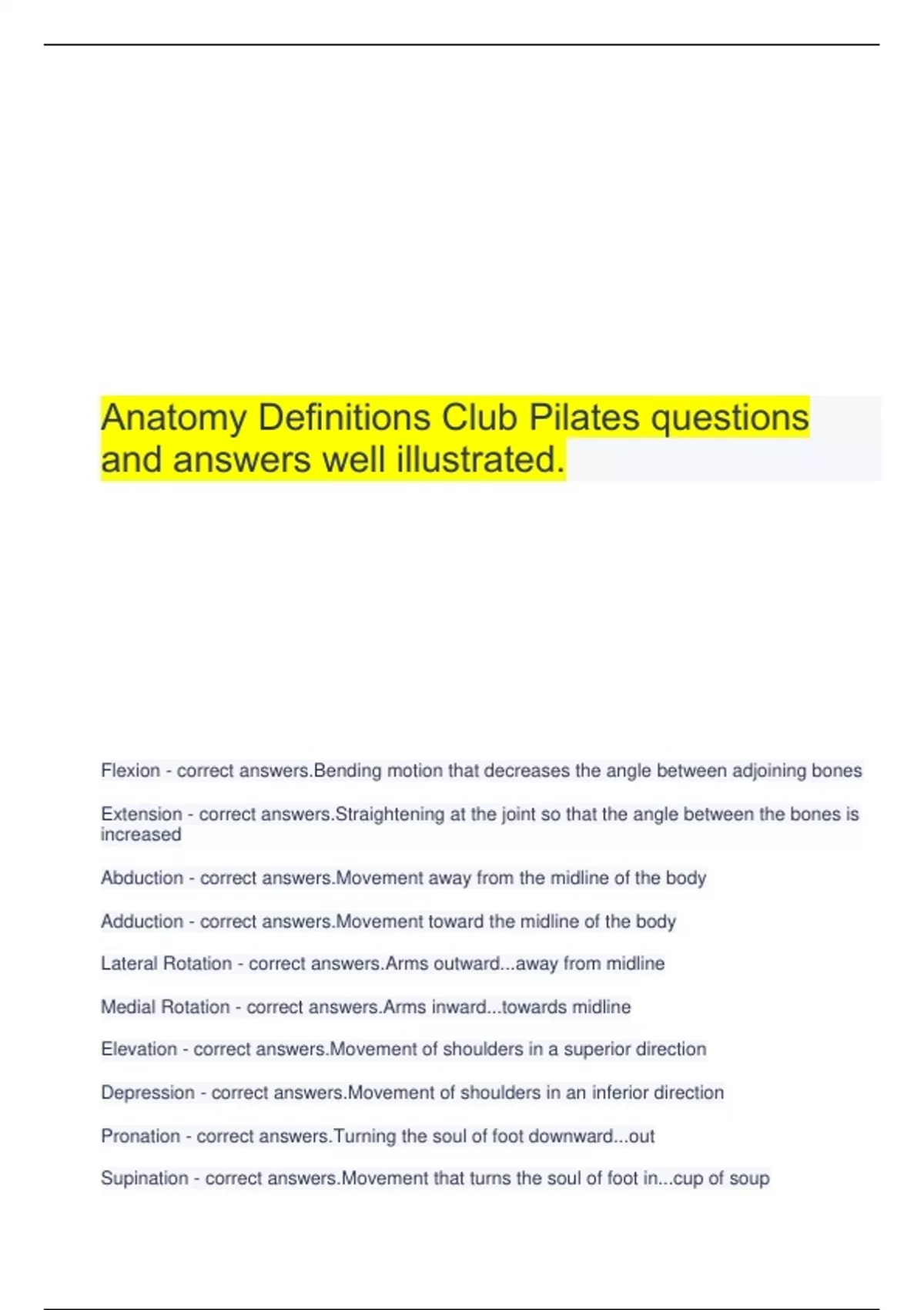Anatomy Definitions Club Pilates questions and answers well illustrated. Flexion - correct answers.Bending motion that decreases the angle between adjoining bones Extension - correct answers.Straightening at the joint so that the angle between the bones is increased Abduction - correct answers.Movement away from the midline of the body Adduction - correct answers.Movement toward the midline of the body Lateral Rotation - correct answers.Arms outward...away from midline Medial Rotation - correct answers.Arms inward...towards midline Elevation - correct answers.Movement of shoulders in a superior direction Depression - correct answers.Movement of shoulders in an inferior direction Pronation - correct answers.Turning the soul of foot downward...out Supination - correct answers.Movement that turns the soul of foot in...cup of soup