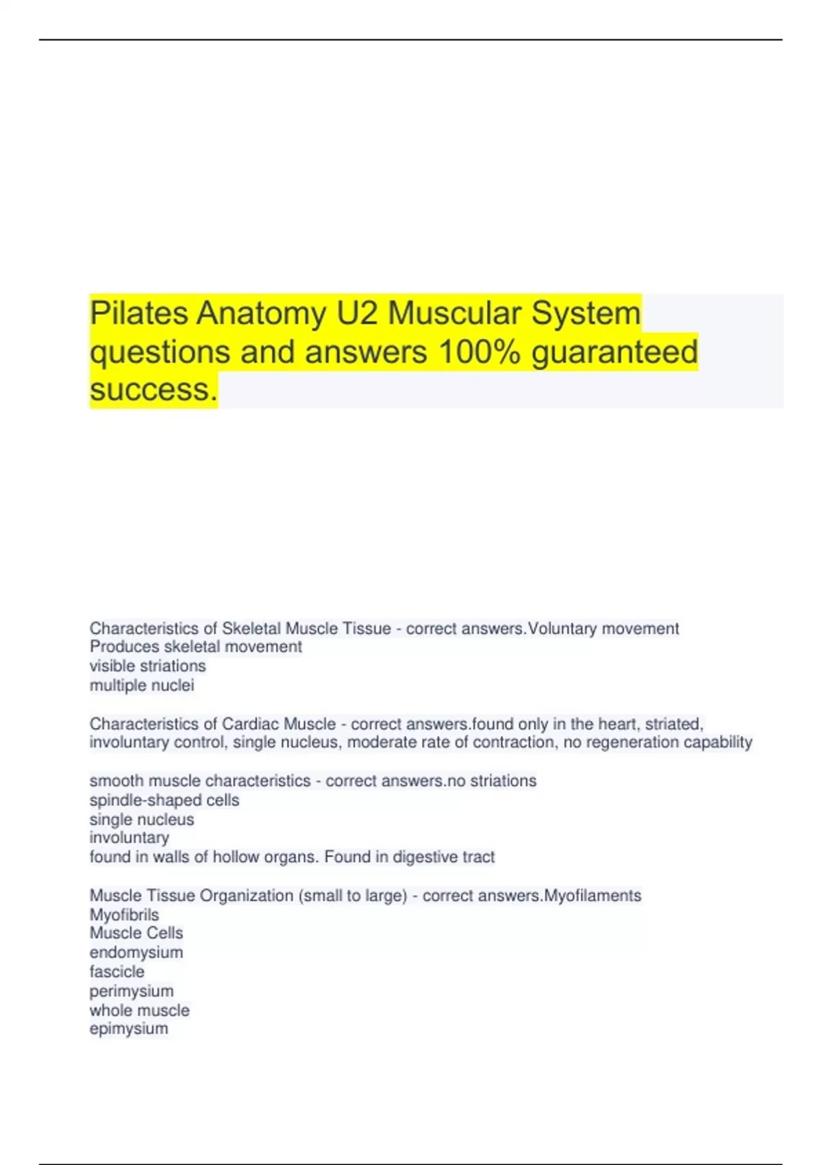 Pilates Anatomy U2 Muscular System questions and answers 100% guaranteed success. Characteristics of Skeletal Muscle Tissue - correct answers.Voluntary movement Produces skeletal movement visible striations multiple nuclei Characteristics of Cardiac Muscle - correct only in the heart, striated, involuntary control, single nucleus, moderate rate of contraction, no regeneration capability smooth muscle characteristics - correct striations spindle-shaped cells single nucleus involuntary found in walls of hollow organs. Found in digestive tract Muscle Tissue Organization (small to large) - correct answers.Myofilaments Myofibrils Muscle Cells endomysium fascicle perimysium whole muscle epimysium