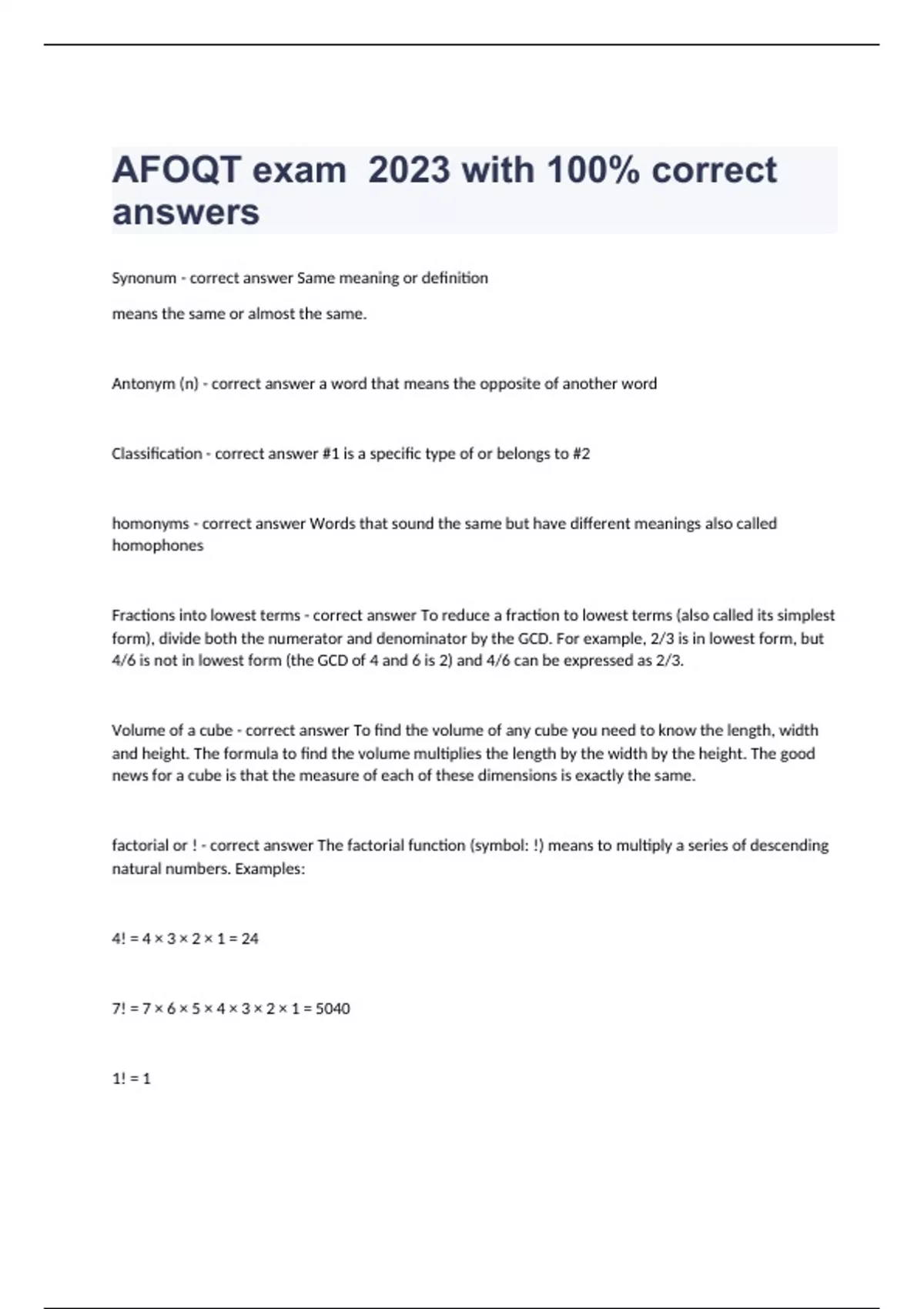 Synonum - correct answer Same meaning or definition means the same or almost the same. Antonym (n) - correct answer a word that means the opposite of another word Classification - correct answer #1 is a specific type of or belongs to #2 homonyms - correct answer Words that sound the same but have different meanings also called homophones Fractions into lowest terms - correct answer To reduce a fraction to lowest terms (also called its simplest form), divide both the numerator and denominator by the GCD. For example, 2/3 is in lowest form, but 4/6 is not in lowest form (the GCD of 4 and 6 is 2) and 4/6 can be expressed as 2/3. Volume of a cube - correct answer To find the volume of any cube you need to know the length, width and height. The formula to find the volume multiplies the length by the width by the height. The good news for a cube is that the measure of each of these dimensions is exactly the same. factorial or ! - correct answer The factorial function (symbol: !) means to multiply a series of descending natural numbers. Examples: 4! = 4 × 3 × 2 × 1 = 24 7! = 7 × 6 × 5 × 4 × 3 × 2 × 1 = 5040 1! = 1 Dividing Fractions - correct answer 1/3 ÷ 2/5 = becomes: 1/3 * __ = Now we flip the second fraction (2/5) over to find its reciprocal, 5/2: