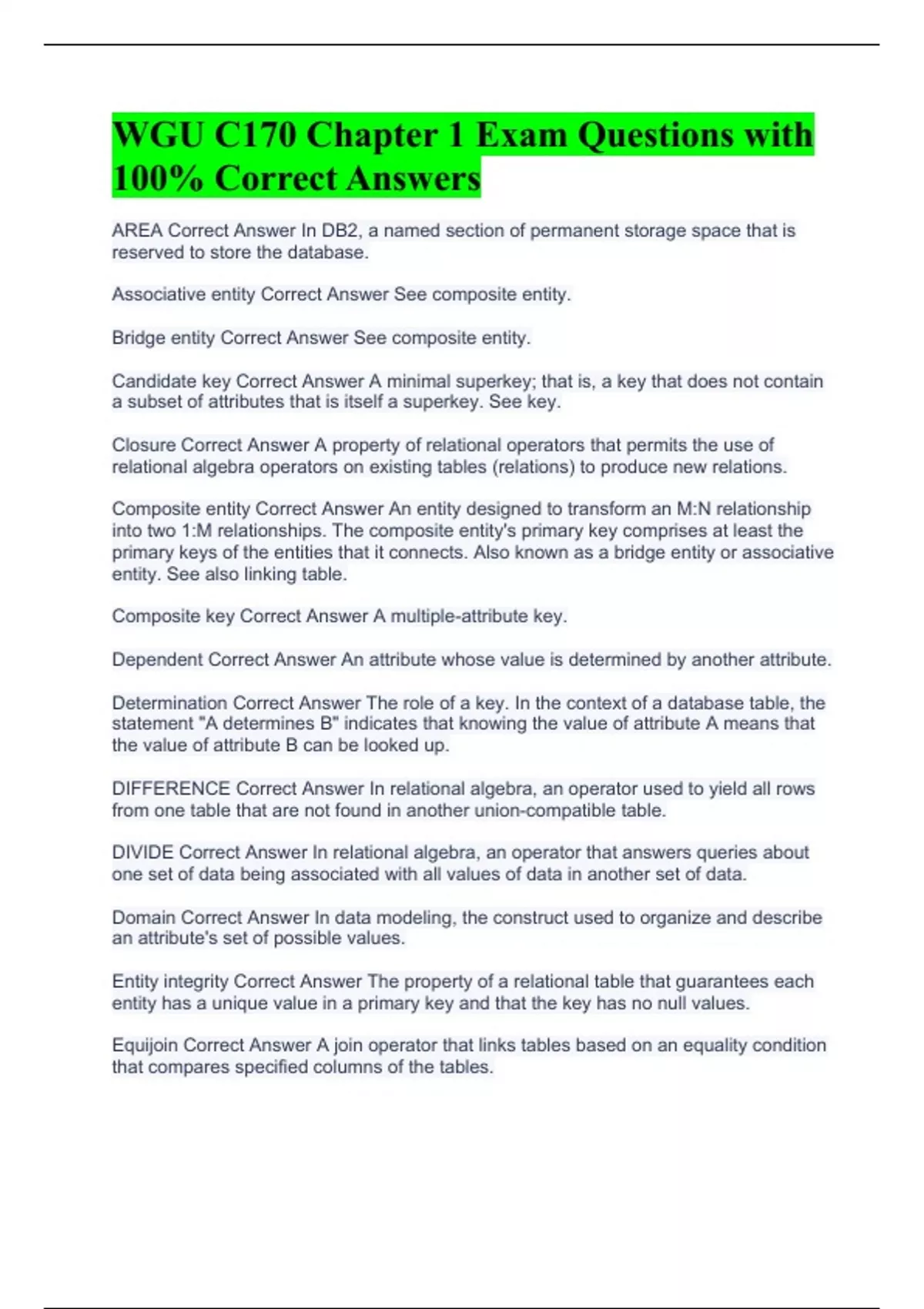AREA Correct Answer In DB2, a named section of permanent storage space that is reserved to store the database. Associative entity Correct Answer See composite entity. Bridge entity Correct Answer See composite entity. Candidate key Correct Answer A minimal superkey; that is, a key that does not contain a subset of attributes that is itself a superkey. See key. Closure Correct Answer A property of relational operators that permits the use of relational algebra operators on existing tables (relations) to produce new relations. Composite entity Correct Answer An entity designed to transform an M:N relationship into two 1:M relationships. The composite entity's primary key comprises at least the primary keys of the entities that it connects. Also known as a bridge entity or associative entity. See also linking table. Composite key Correct Answer A multiple-attribute key. Dependent Correct Answer An attribute whose value is determined by another attribute. Determination Correct Answer The role of a key. In the context of a database table, the statement "A determines B" indicates that knowing the value of attribute A means that the value of attribute B can be looked up. DIFFERENCE Correct Answer In relational algebra, an operator used to yield all rows from one table that are not found in another union-compatible table. DIVIDE Correct Answer In relational algebra, an operator that answers queries about one set of data being associated with all values of data in another set of data. Domain Correct Answer In data modeling, the construct used to organize and describe an attribute's set of possible values. Entity integrity Correct Answer The property of a relational table that guarantees each entity has a unique value in a primary key and that the key has no null values. Equijoin Correct Answer A join operator that links tables based on an equality condition that compares specified columns of the tables.