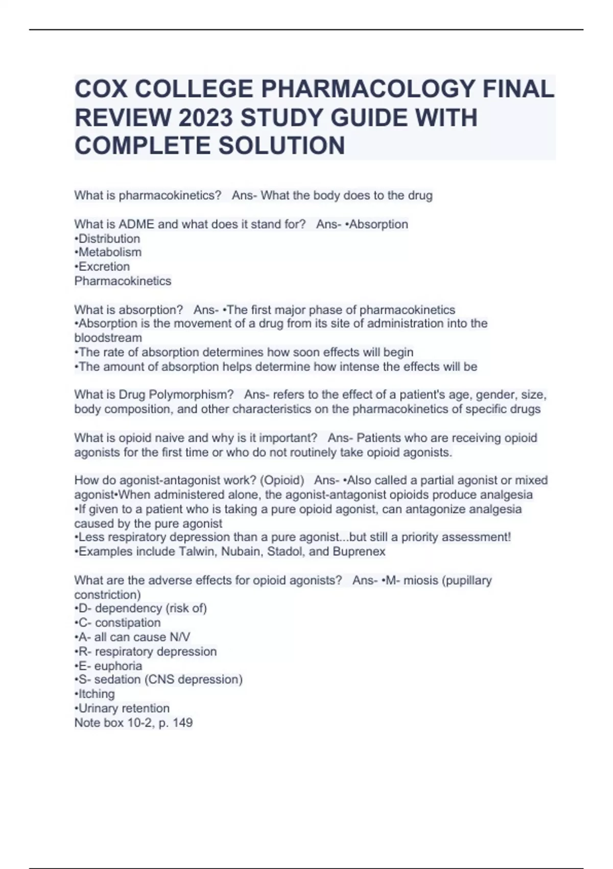COX COLLEGE PHARMACOLOGY FINAL REVIEW 2023 STUDY GUIDE WITH COMPLETE SOLUTION